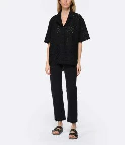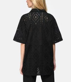 Chemise noire effet broderie anglaise. Ajourée. Manches courtes. Col chemisier. Fermeture par boutons noirs sur le devant. Coupe droite. Base droite.