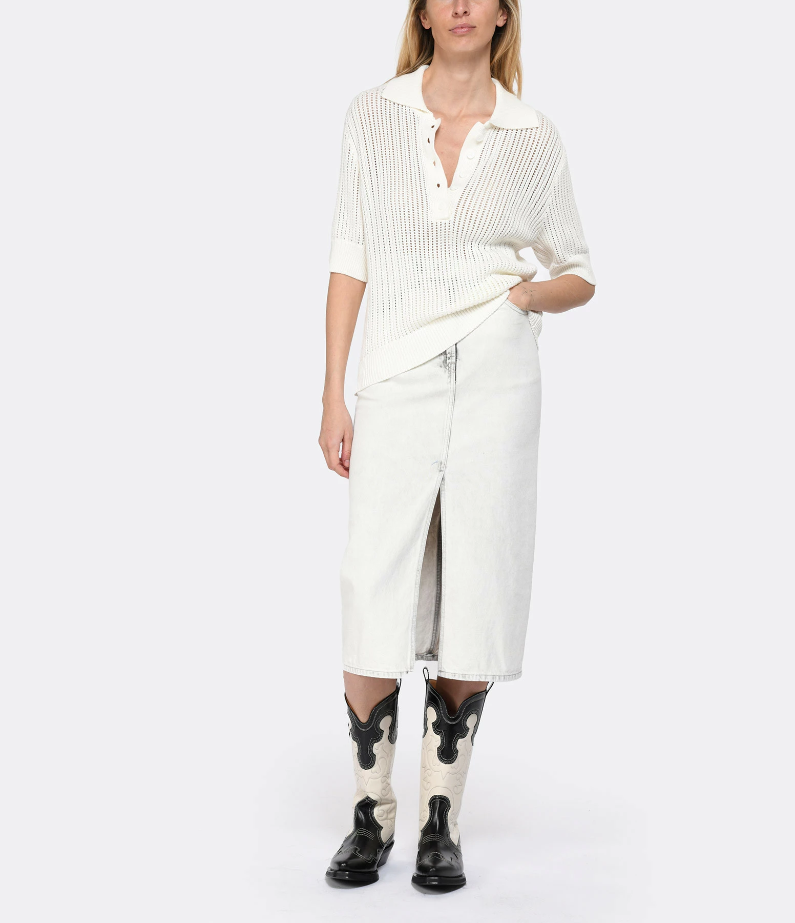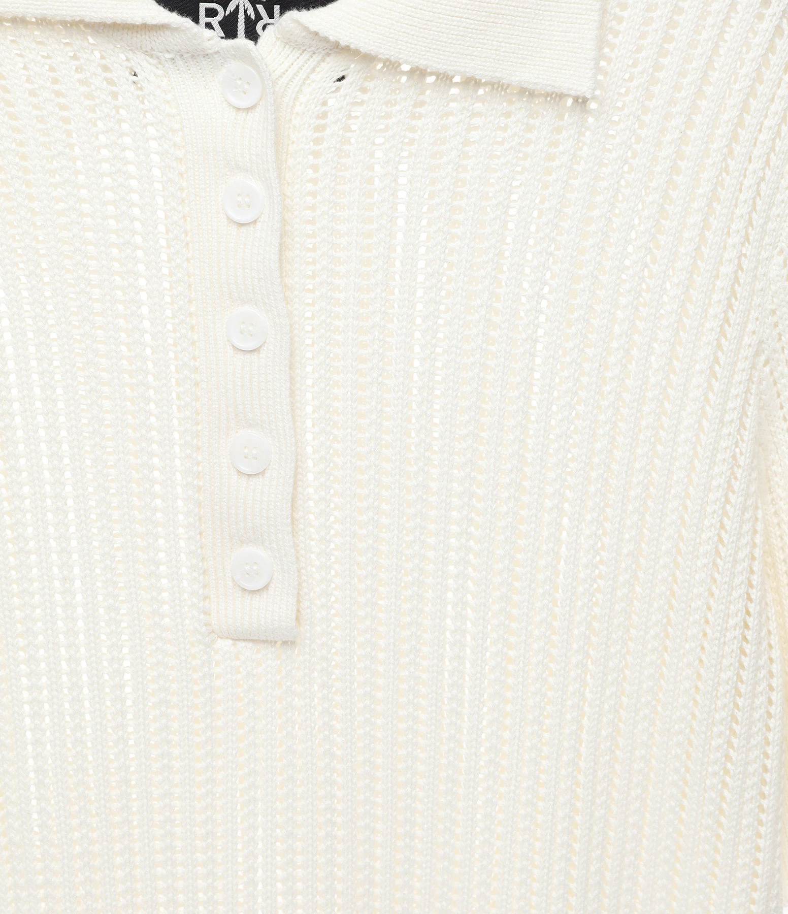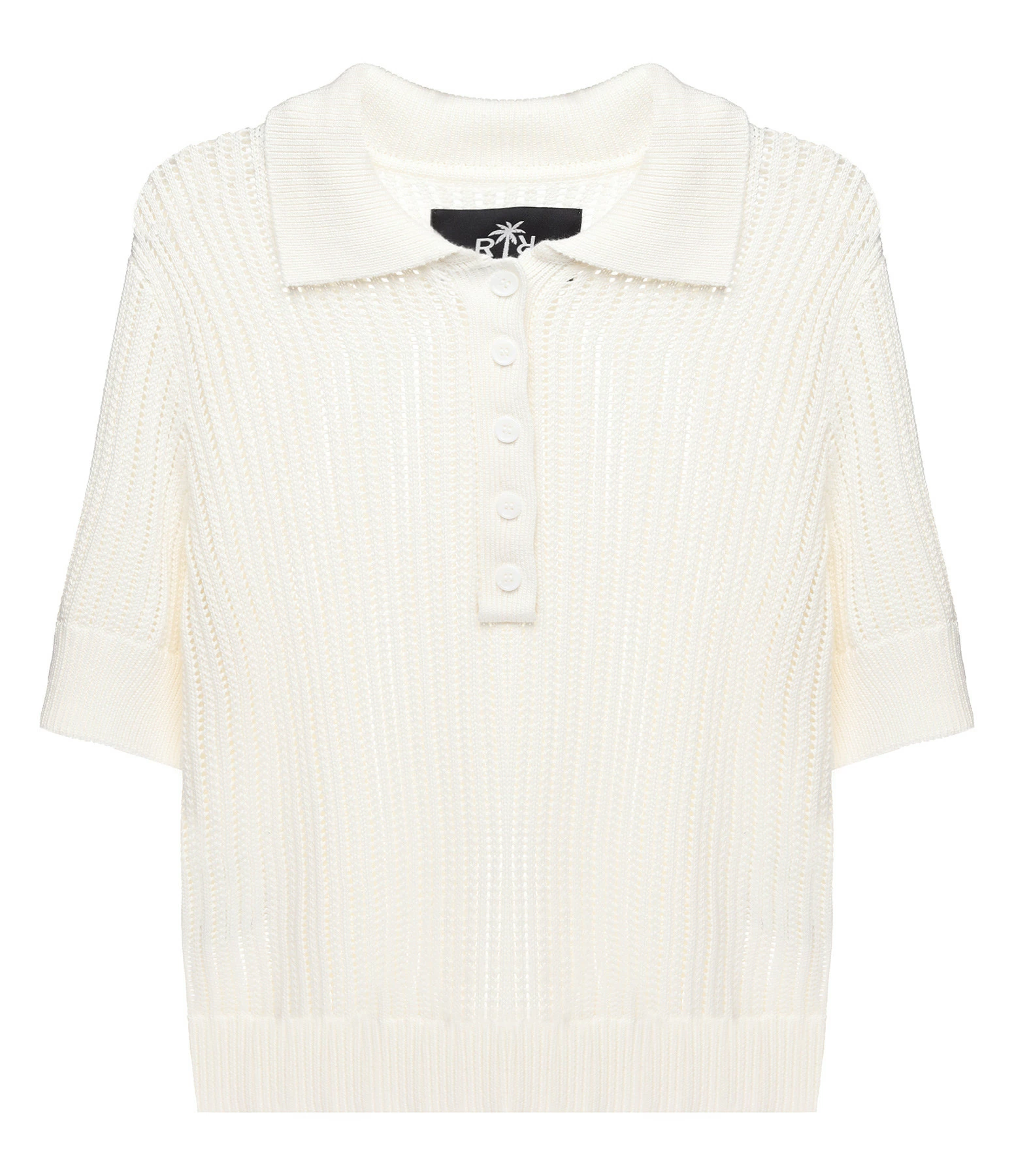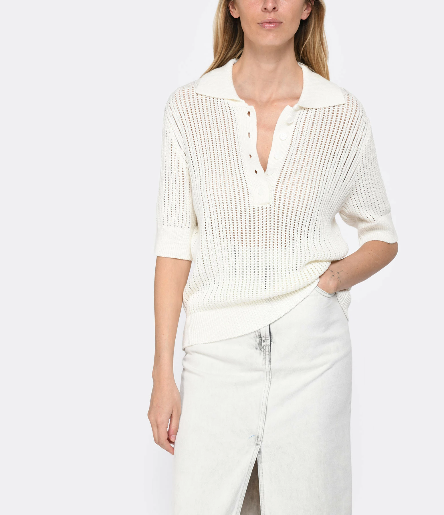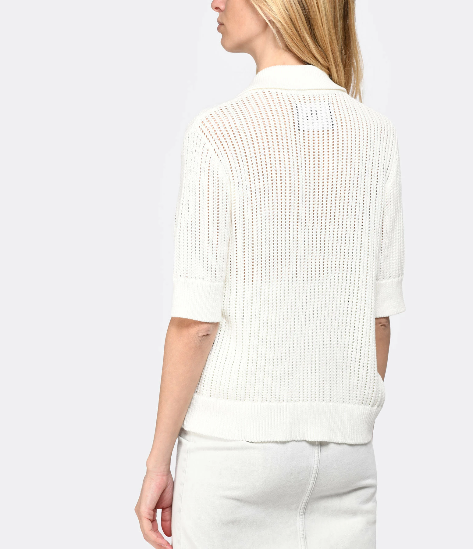Polo blanc effet crochet. Ajouré. Col polo avec fermeture par boutons blancs sur le devant. Manches courtes. Coupe droite. Base droite.