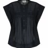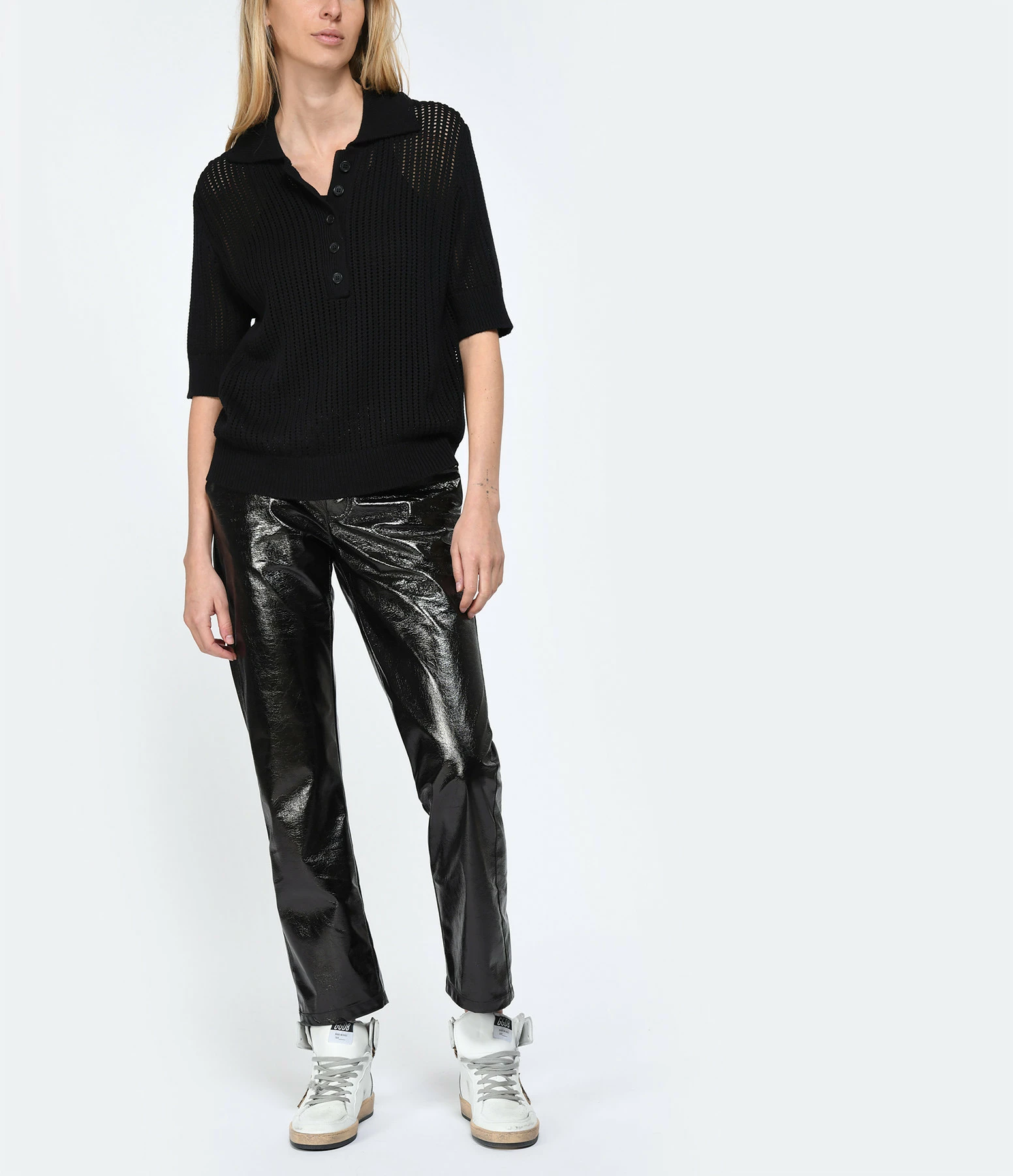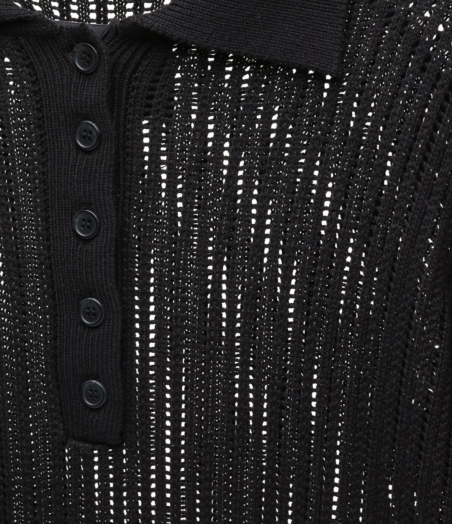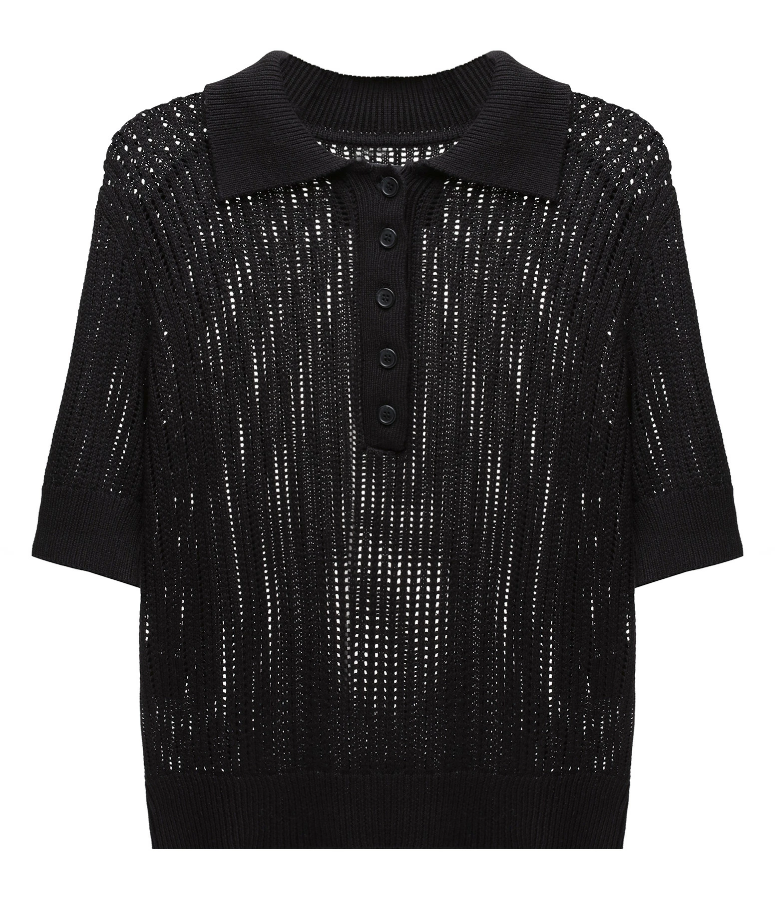 Polo noir effet crochet. Ajouré. Col polo avec fermeture par boutons noirs sur le devant. Manches courtes. Coupe droite. Base droite.