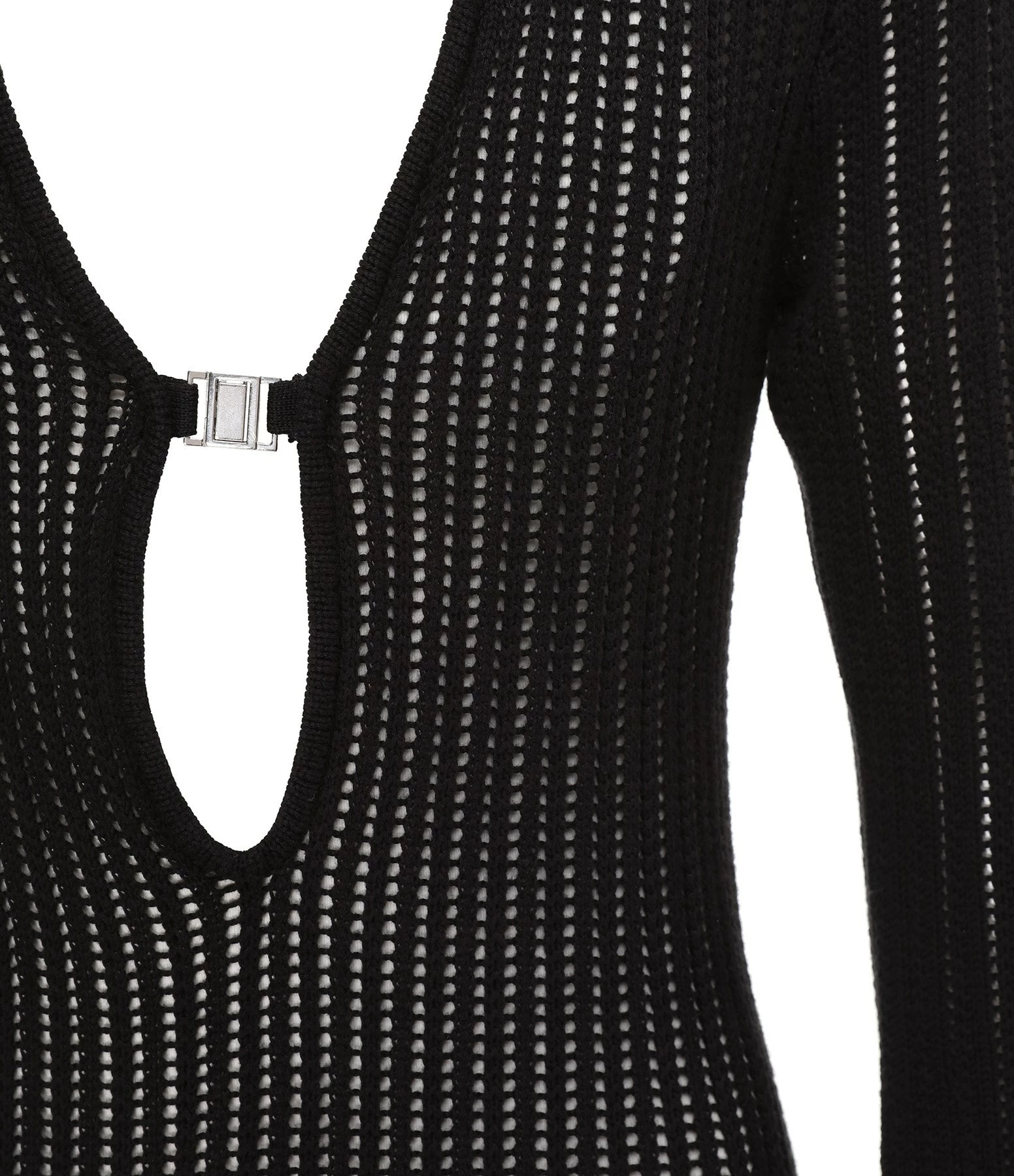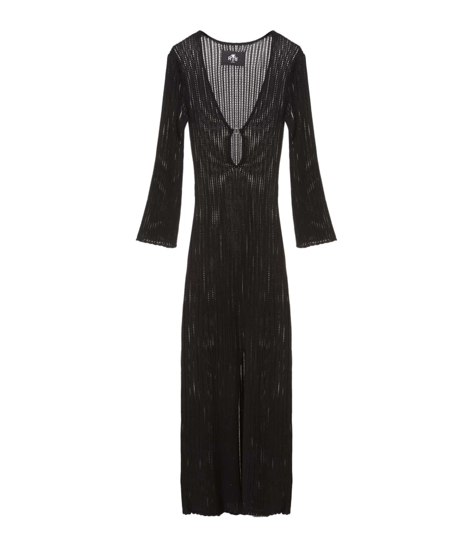 Robe longue en maille noire. Manches longues. Fermeture par crochet métallique sur me devant au niveau de la poitrine. Fente centrale au bas. Coupe droite. Base droite.