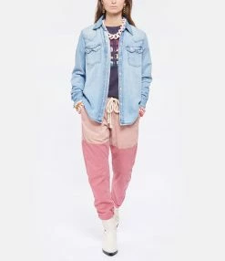 Chemise en denim bleu. Col chemise. Manches longues. Deux poches plaquées à rabats boutonnés sur la poitrine. Coupe droite. Base arrondie.