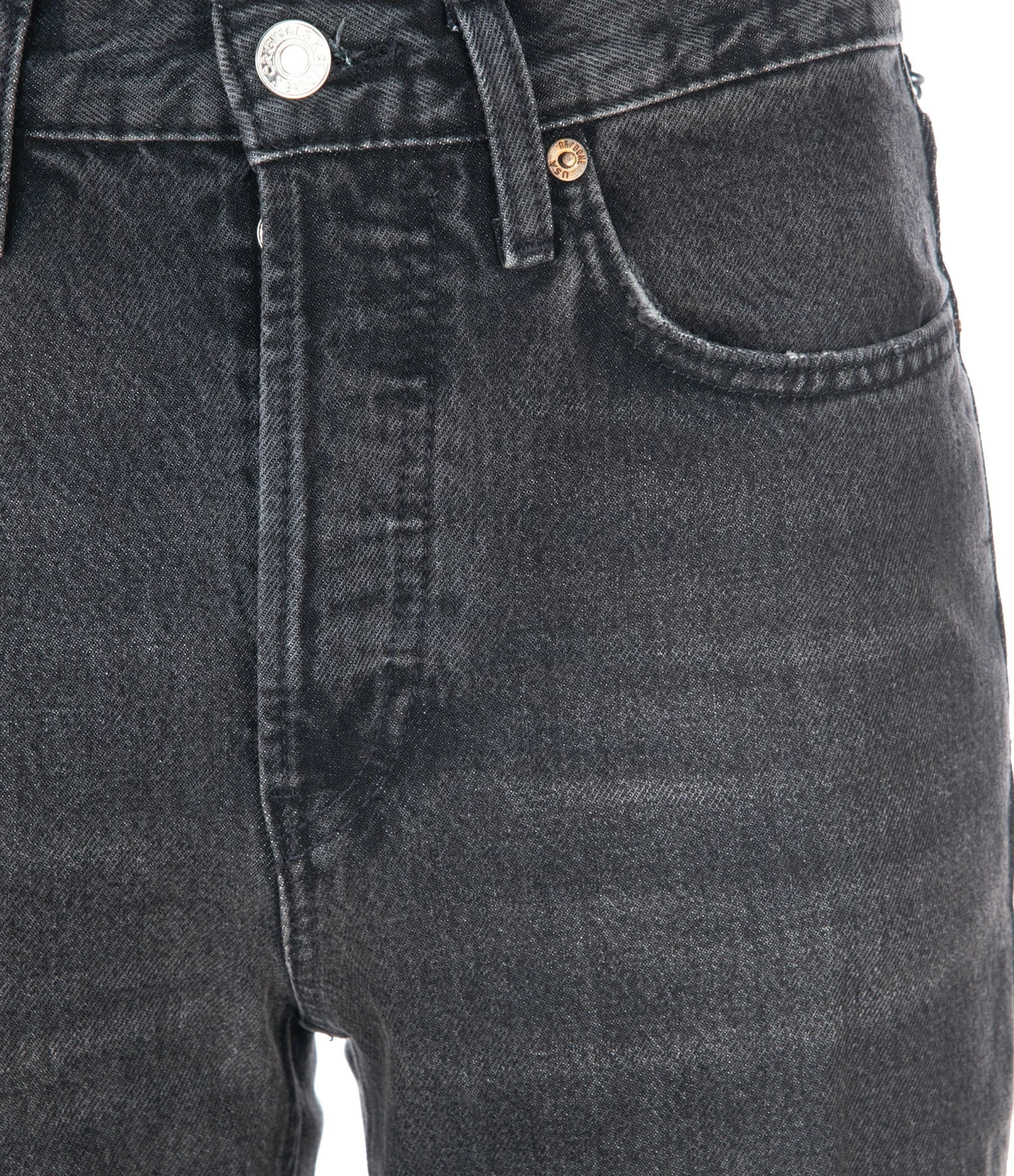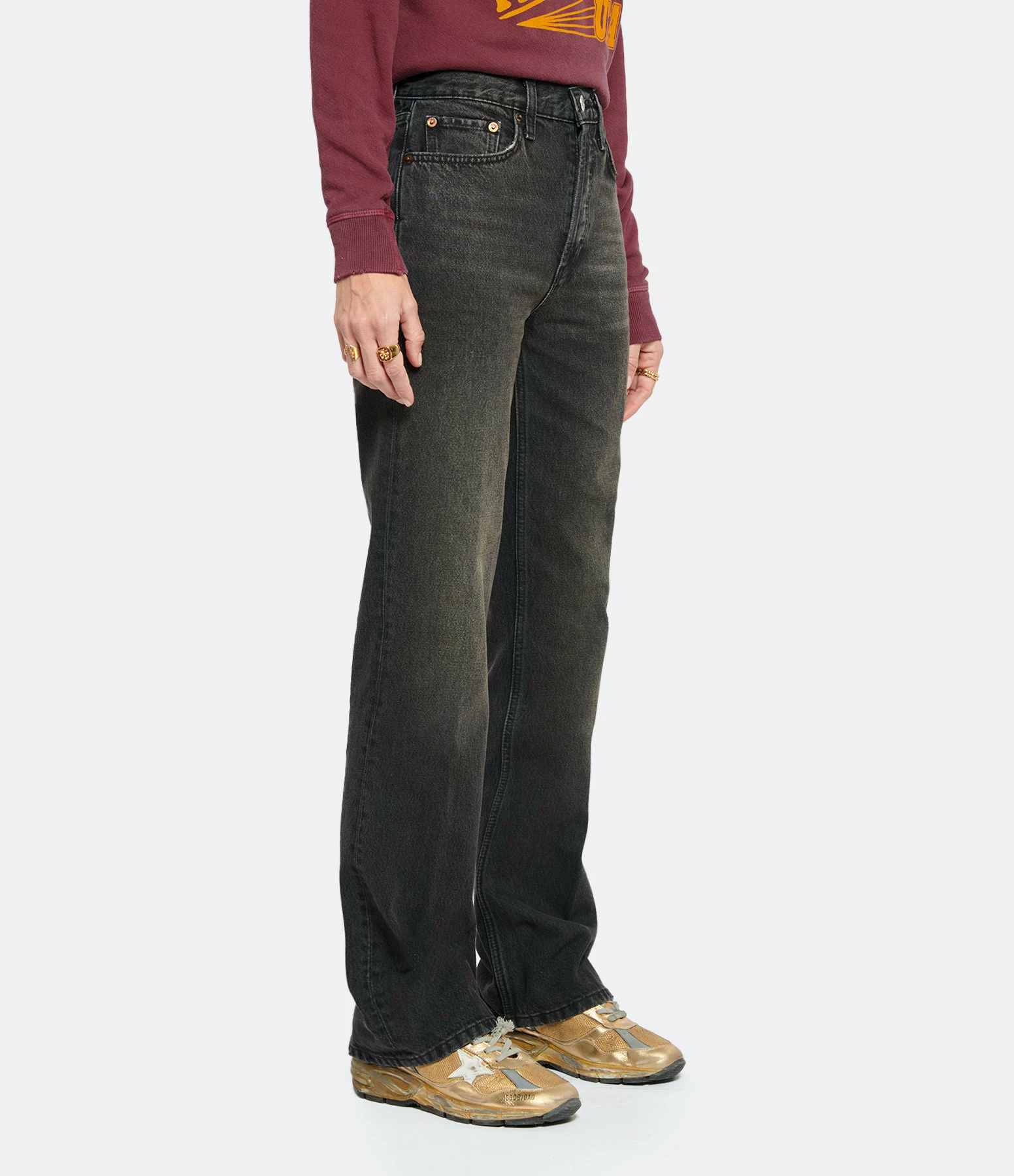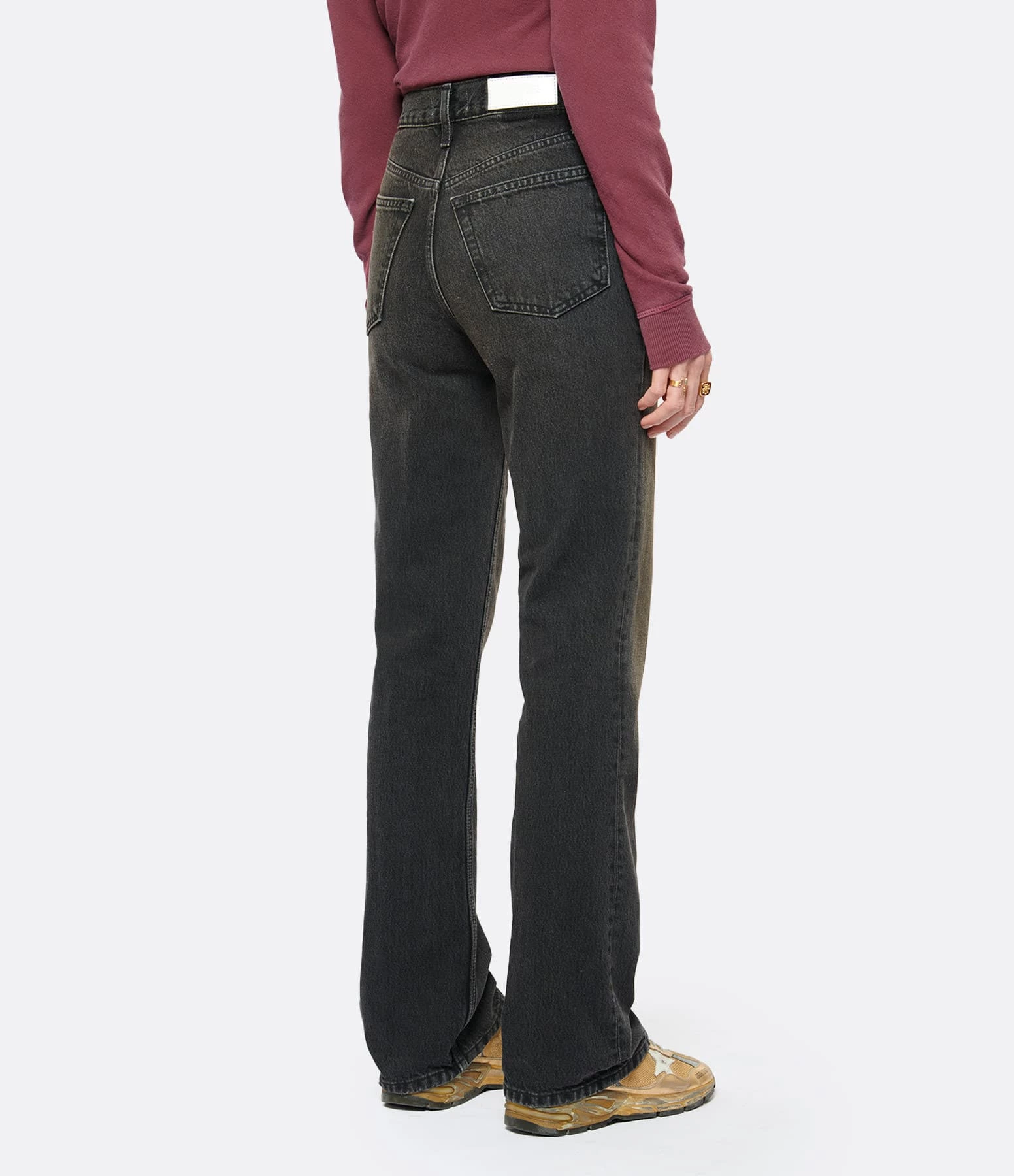 Jean bootcut en denim noir délavé. Taille haute. Fermeture boutonnée. Cinq poches. Coupe droite, évasée sur le bas.