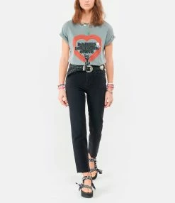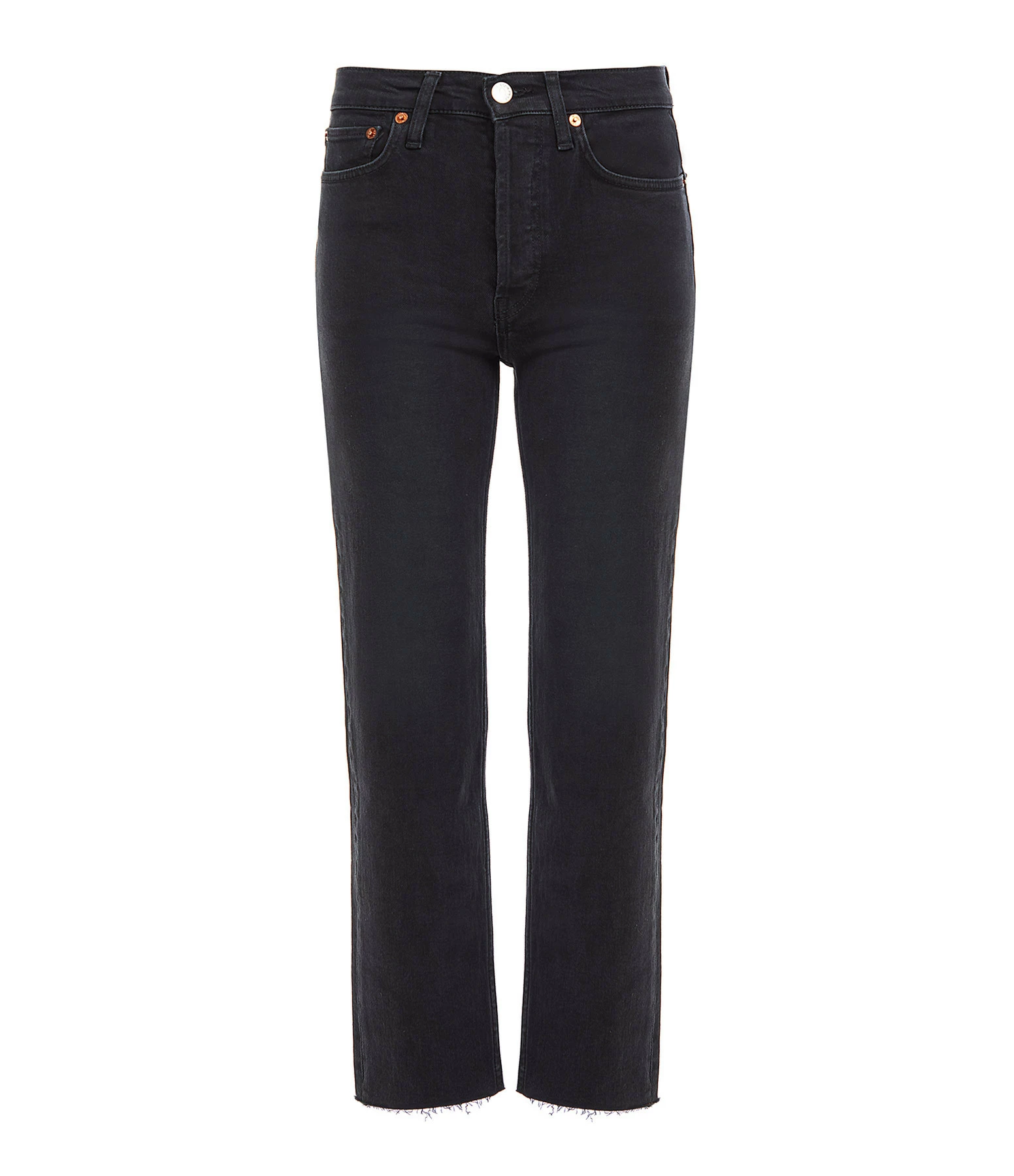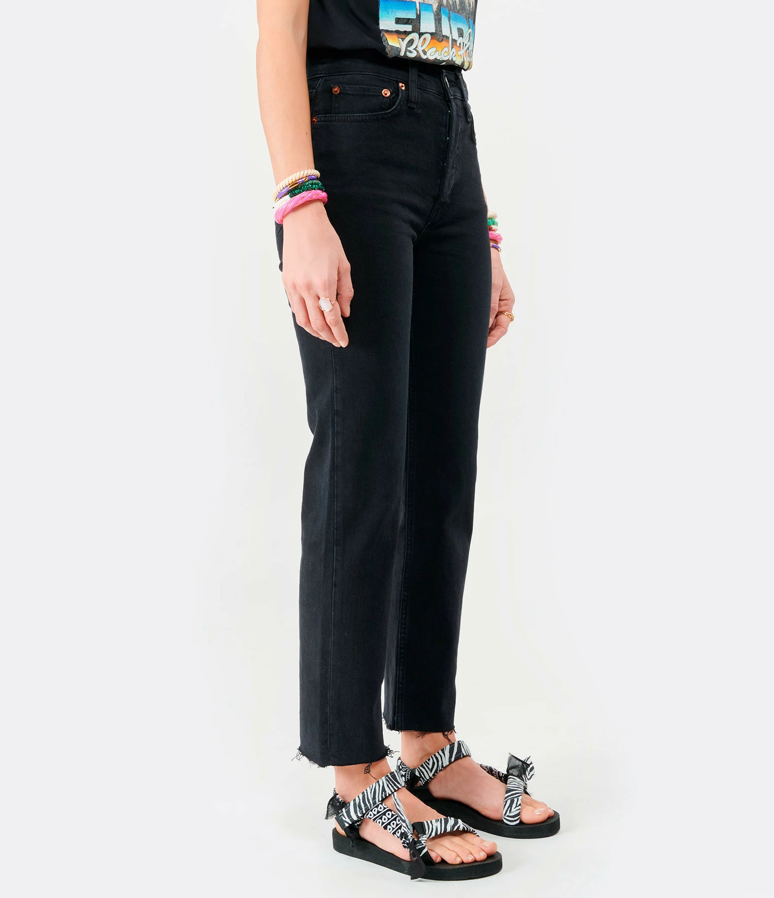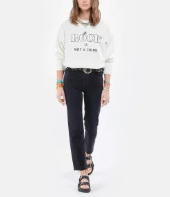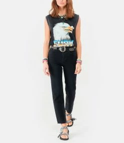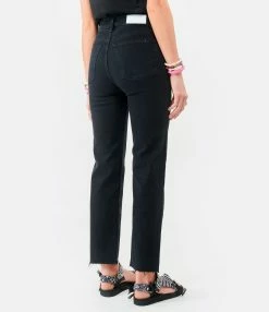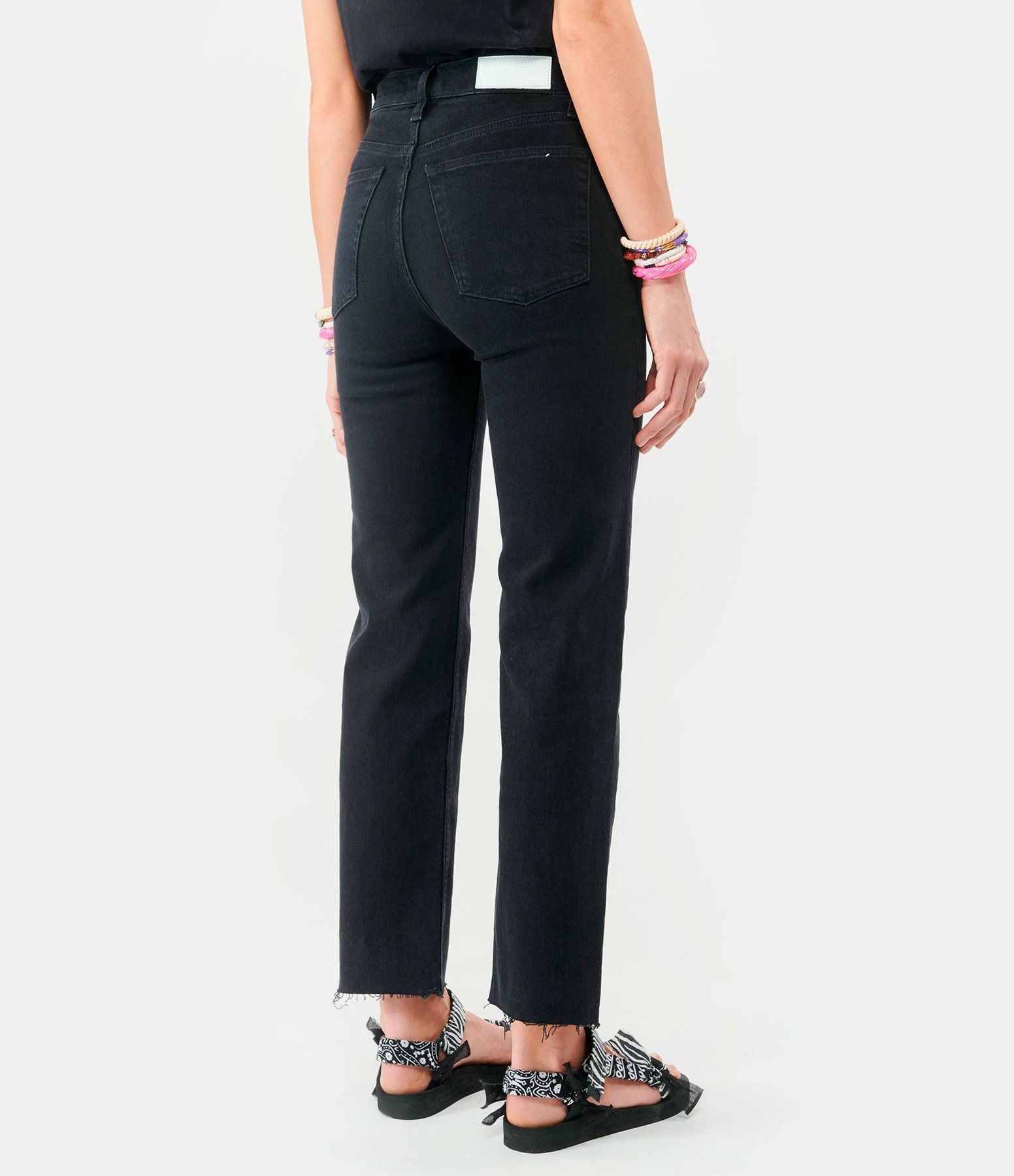 Jean taille haute en denim noir délavé. Cinq poches dont une poche briquet. Coupe mom. Bas de jambes effilochés. Fermeture par zip et bouton.