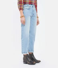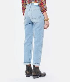 Jean droit en denim bleu délavé. Taille mi-haute. Cinq poches. Fermeture boutonnée. Coupe droite.