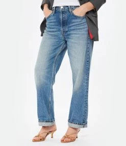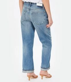 Jean en coton bleu effet délavé. Braguette boutonnée. Taille haute avec passants pour ceinture. Cinq poches plaquées. Patch en cuir lisse blanc avec inscription “RE/DONE” cousu dans le dos. Coupe boyfriend. Base droite.