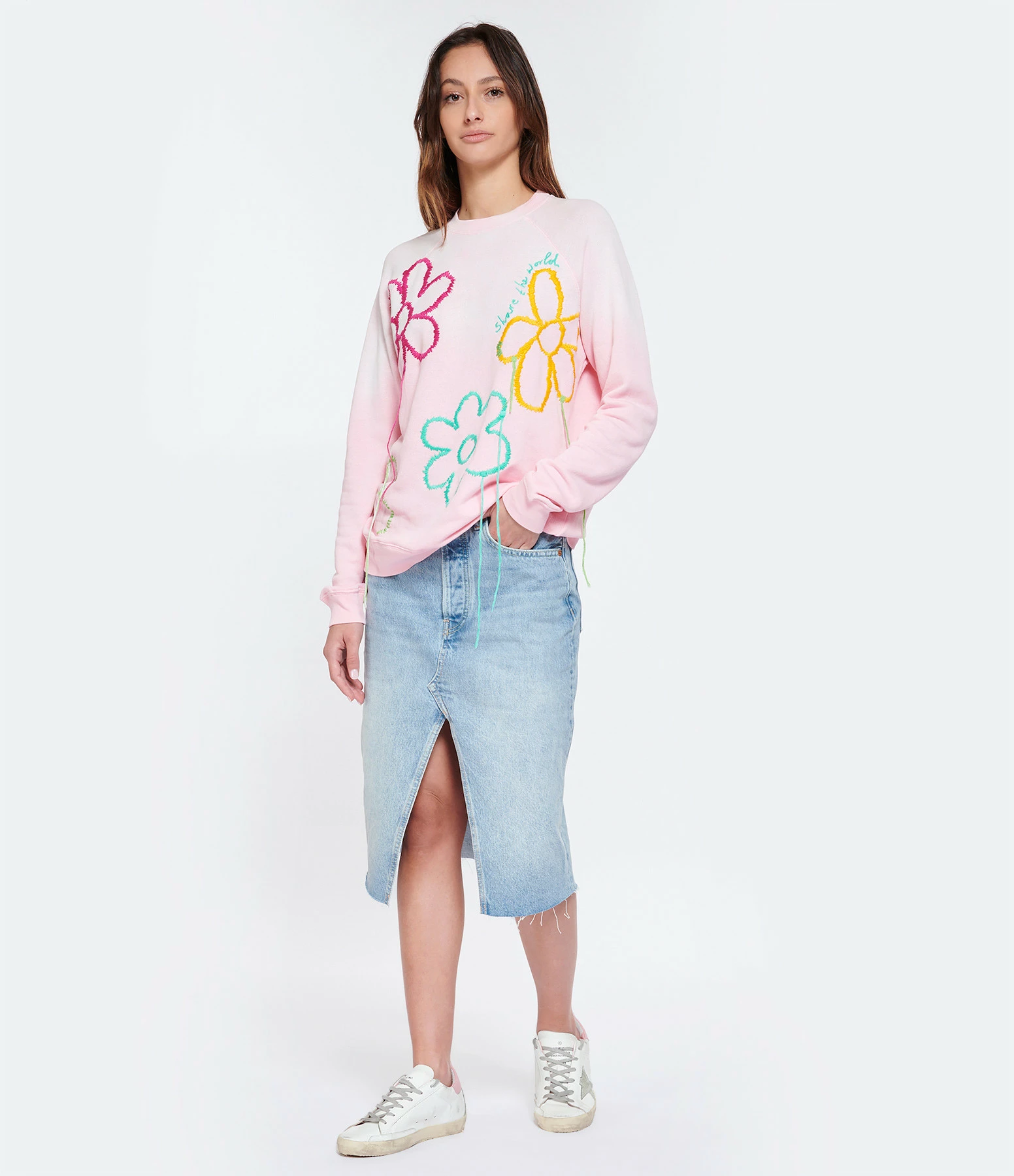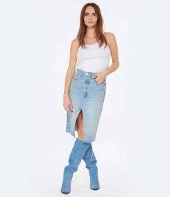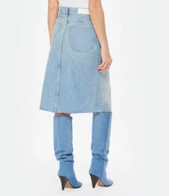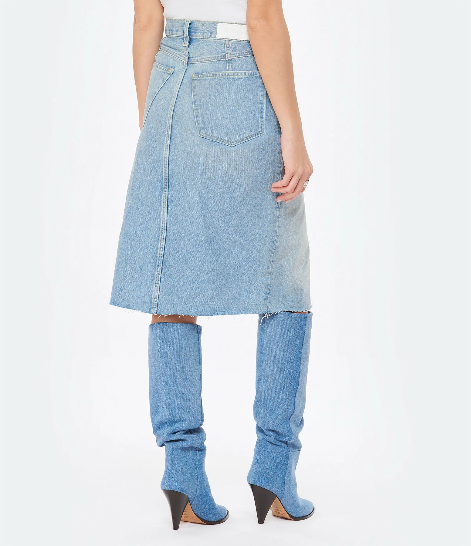 Jupe midi en denim de coton bleu clair délavé. Fente au centre sur le devant. Braguette à boutons métalliques. Deux poches italiennes et une poche à gousset. Deux poches plaquées dans le dos. Coupe évasée. Base droite coupée à cru.