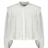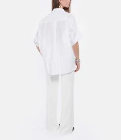 Blouse en coton blanc. Col chemise. Manches courtes effet chauve souris. Fermeture boutonnée. Coupe ample. Base droite.