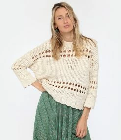 Pull en crochet écru. Manches trois-quarts. Ajouré à certains endroits. Col rond. Coupe droite. Base droite.