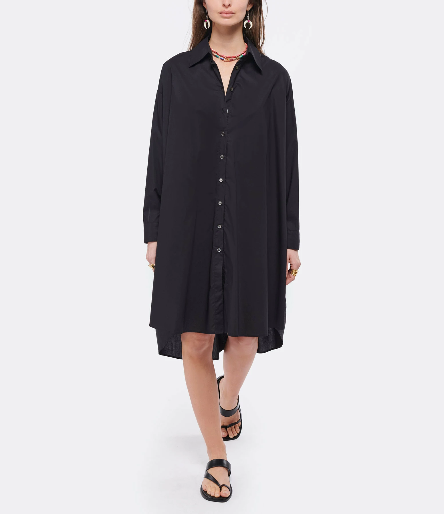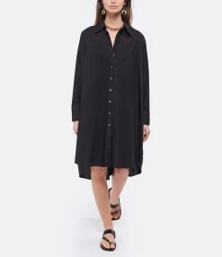Robe chemise en coton noir. Col chemise. Manches longues. Fermeture boutonnée. Deux poches fendues. Coupe ample. Base droite, plus longue à l’arrière.