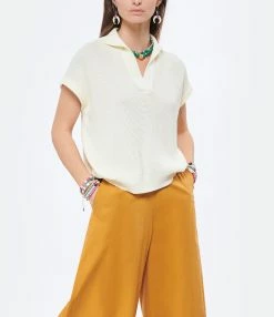 Top en coton écru. Col V à rabats. Manches courtes. Coupe droite. Base droite.