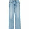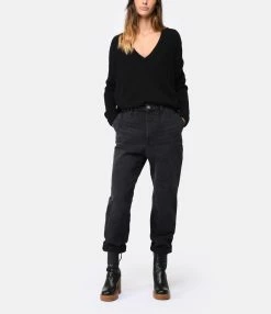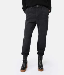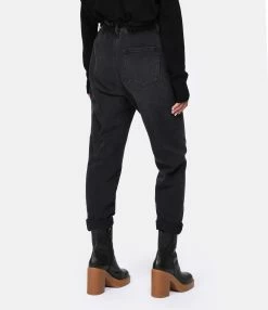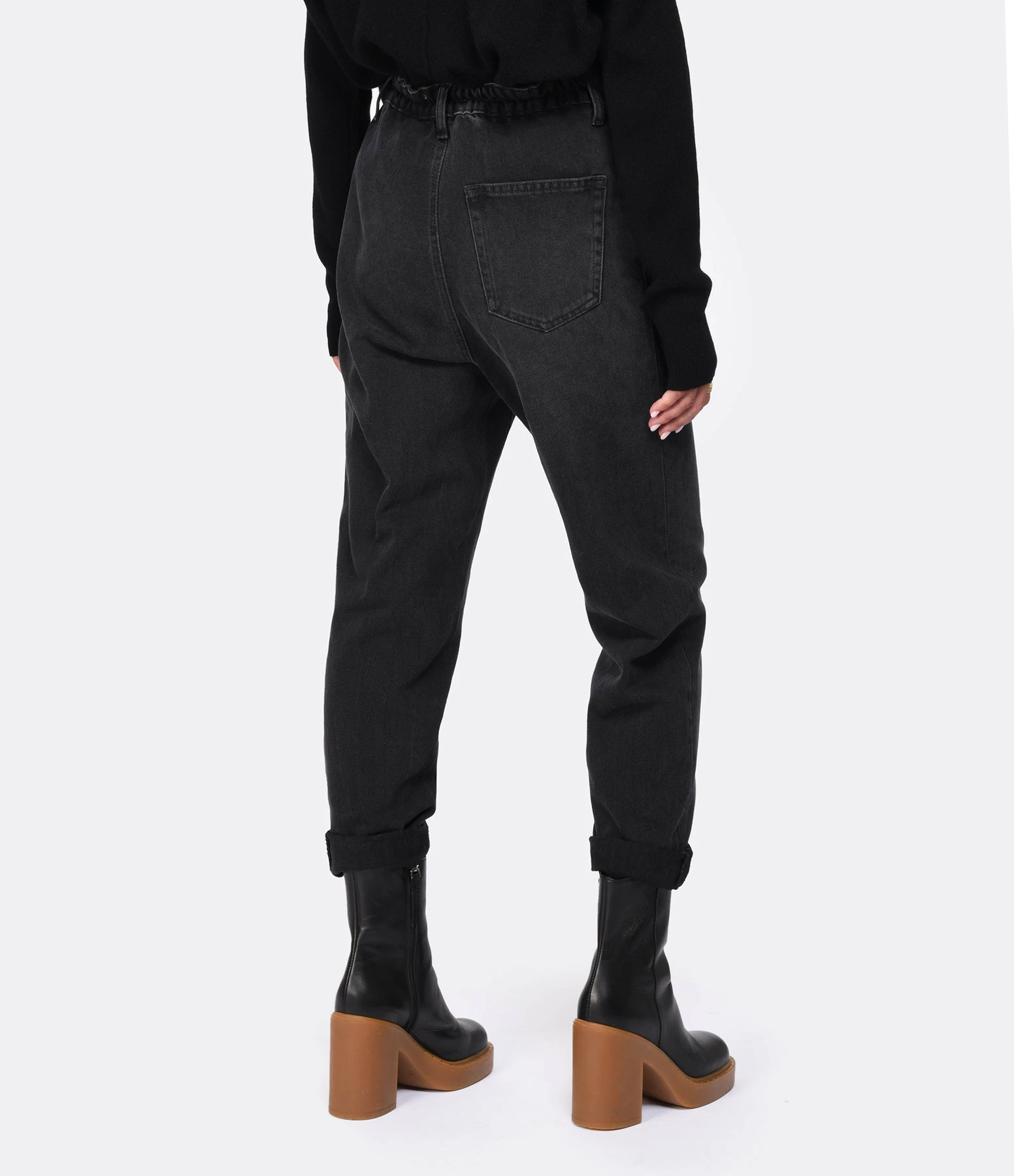 Pantalon en denim de coton noir. Taille haute avec passants pour ceinture et dos élastiqué. Fermeture zippée sous la braguette et boutonnée sur le devant. Bouton métallique argenté. Deux poches prises dans les coutures latérales sur le devant. Une poche plaquée dans le dos. Longueur raccourcie. Coupe droite. Base droite.