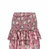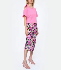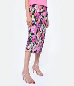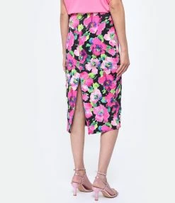 Jupe crayon mi-longue à imprimé fleuri rose. Coupe ajustée. Base droite.
