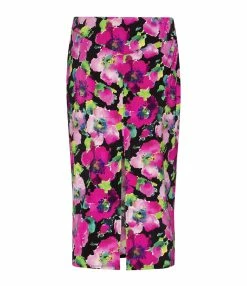 Jupe crayon mi-longue à imprimé fleuri rose. Coupe ajustée. Base droite.