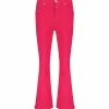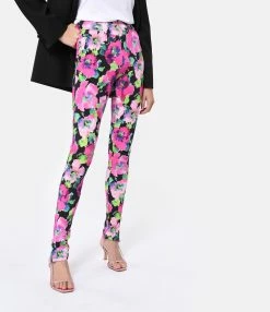 Pantalon slim effet legging à imprimé fleuri rose. Taille élastiquée. Coupe droite. Base droite.