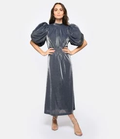 Robe midi bleu nuit métallisé. Col rond avec liens à nouer dans la nuque. Dos échancré. Manches coutes ballon. Taille resserrée, froncée et élastiquée dans le dos avec liens à nouer. Coupe buste droite. Coupe jupe évasée. Doublée.