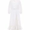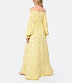 Robe longue jaune à imprimé fleuris. Col bardot élastiqué. Manches longues ballons resserrées par élastiques et volants aux poignets. Coupe évasée. Base droite.