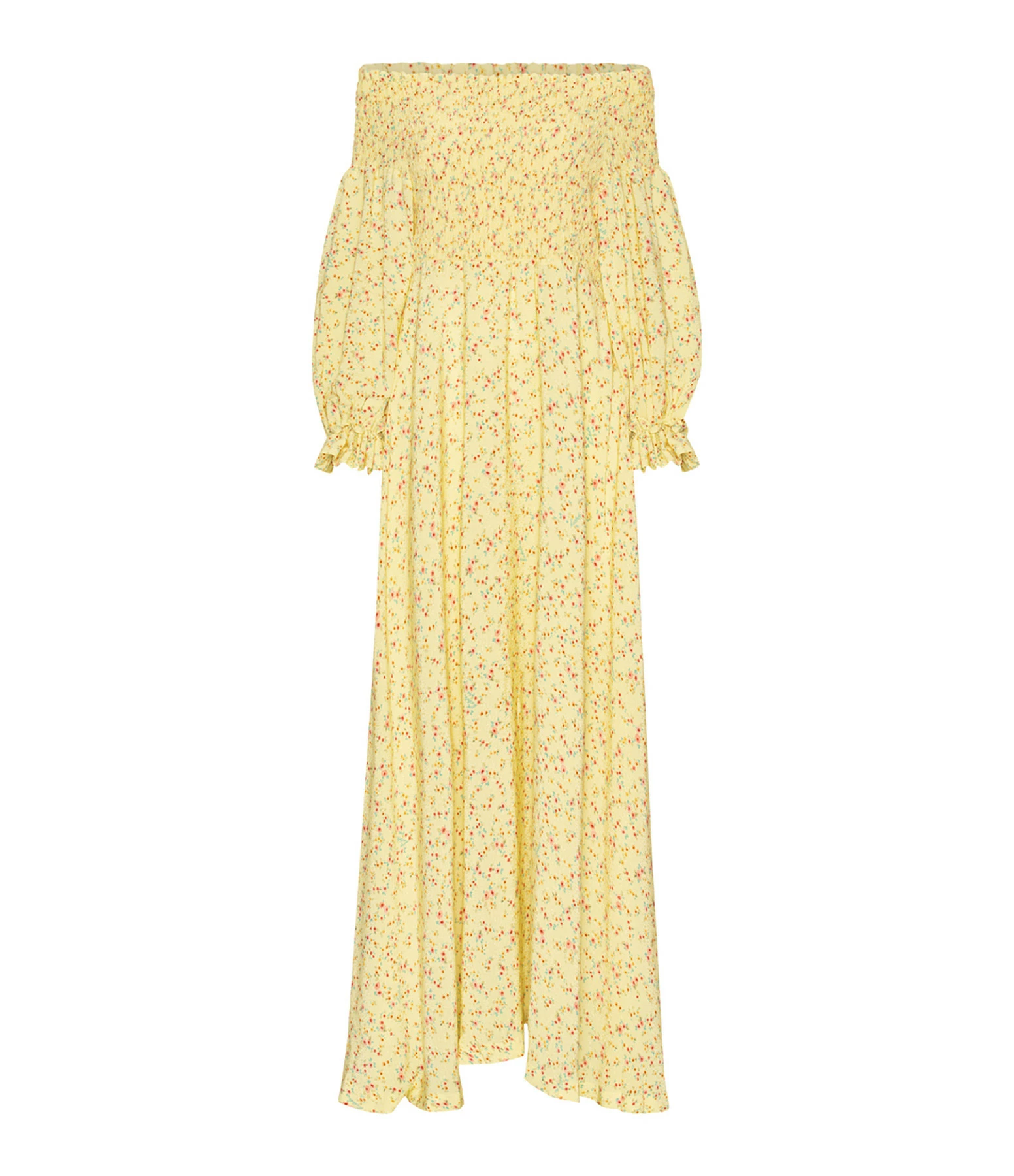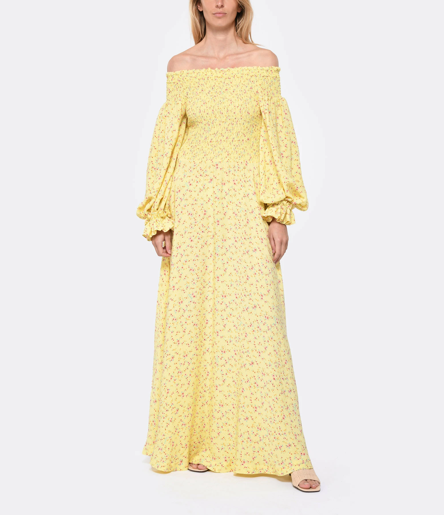 Robe longue jaune à imprimé fleuris. Col bardot élastiqué. Manches longues ballons resserrées par élastiques et volants aux poignets. Coupe évasée. Base droite.