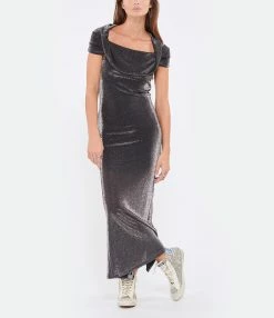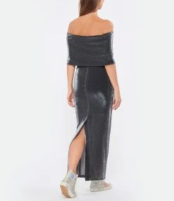 Robe longue en jersey noir métallisé. Encolure Bardot. Sans manches. Fermeture zippée invisible latérale. Fente milieu dos. Coupe près du corps. Base droite. Doublée.