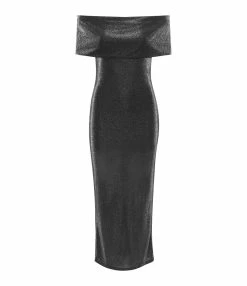 Robe longue en jersey noir métallisé. Encolure Bardot. Sans manches. Fermeture zippée invisible latérale. Fente milieu dos. Coupe près du corps. Base droite. Doublée.