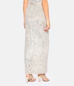 Jupe longue à sequins argentés soulignée de fronces. Fente latérale sur le devant. Fermeture zippée invisible dans le dos. Coupe près du corps. Base droite. Doublée.