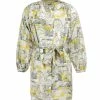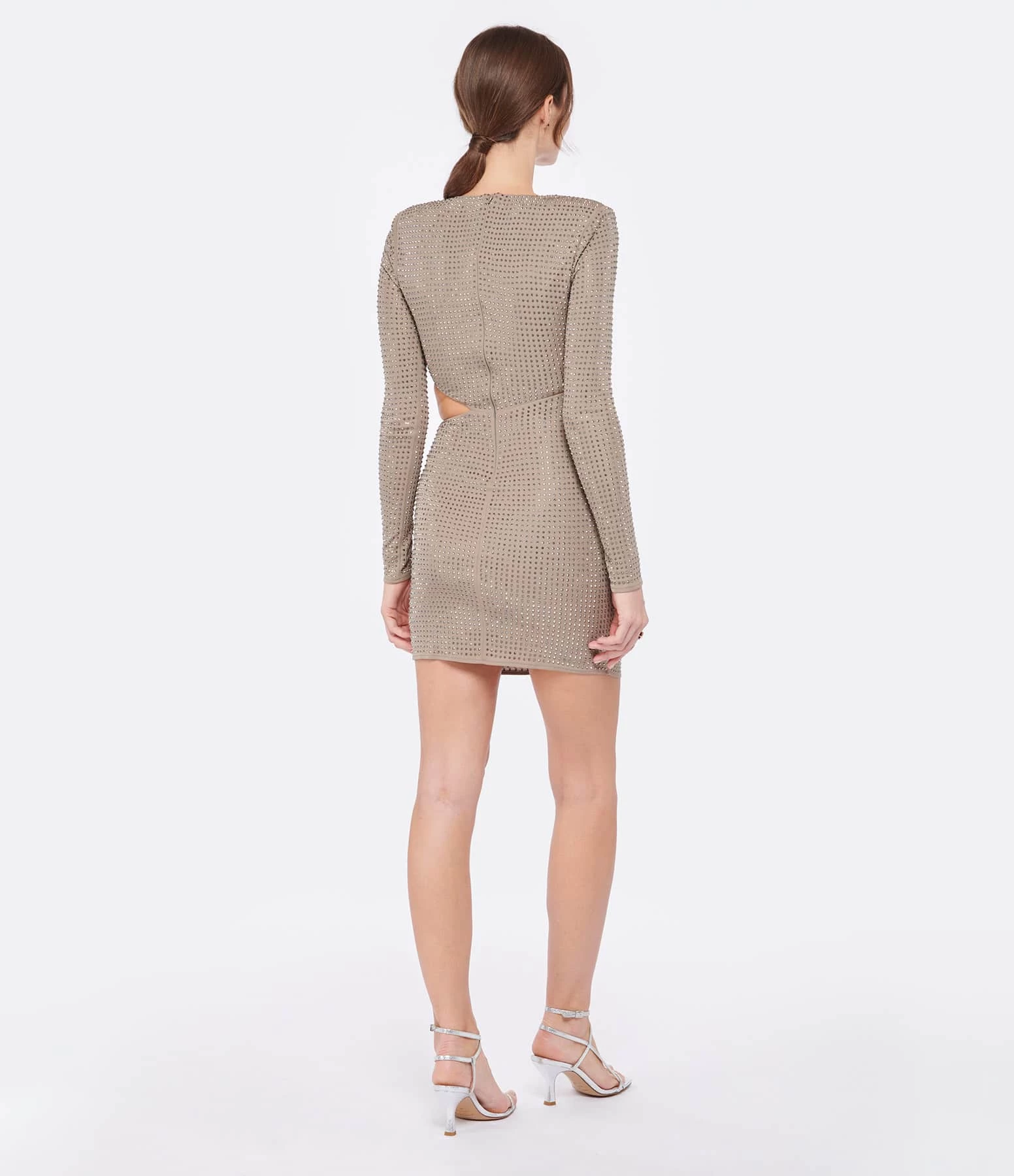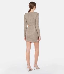 Robe courte grise à paillettes. Col rond. Resserrée à la taille. Manches longues. Epaulettes. Coupe ajustée. Fermeture zippée invisible dans le dos. Doublée. Base arrondie.