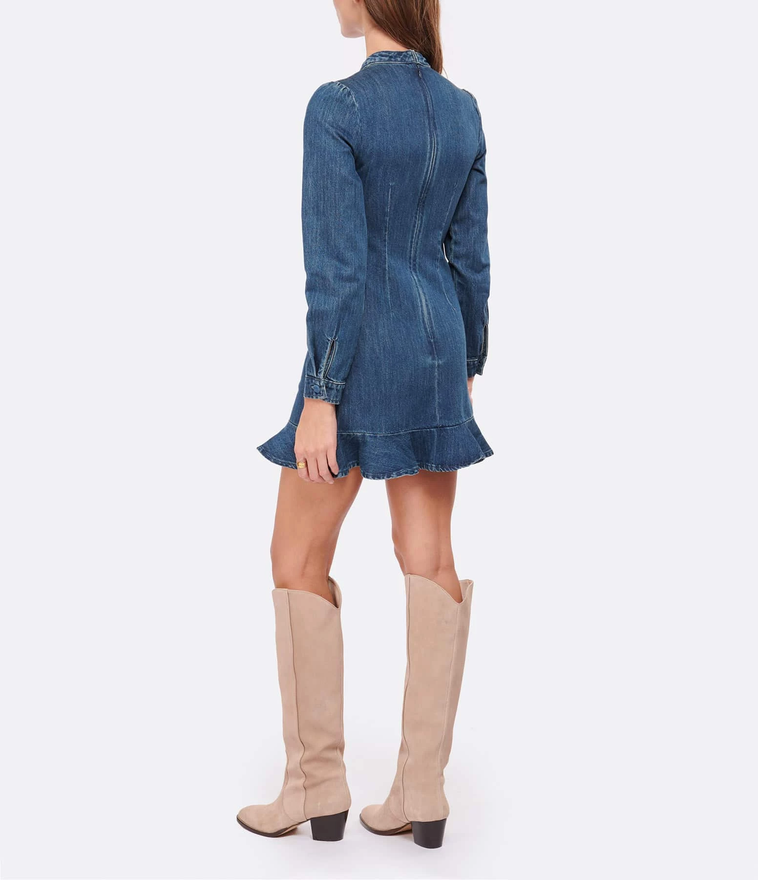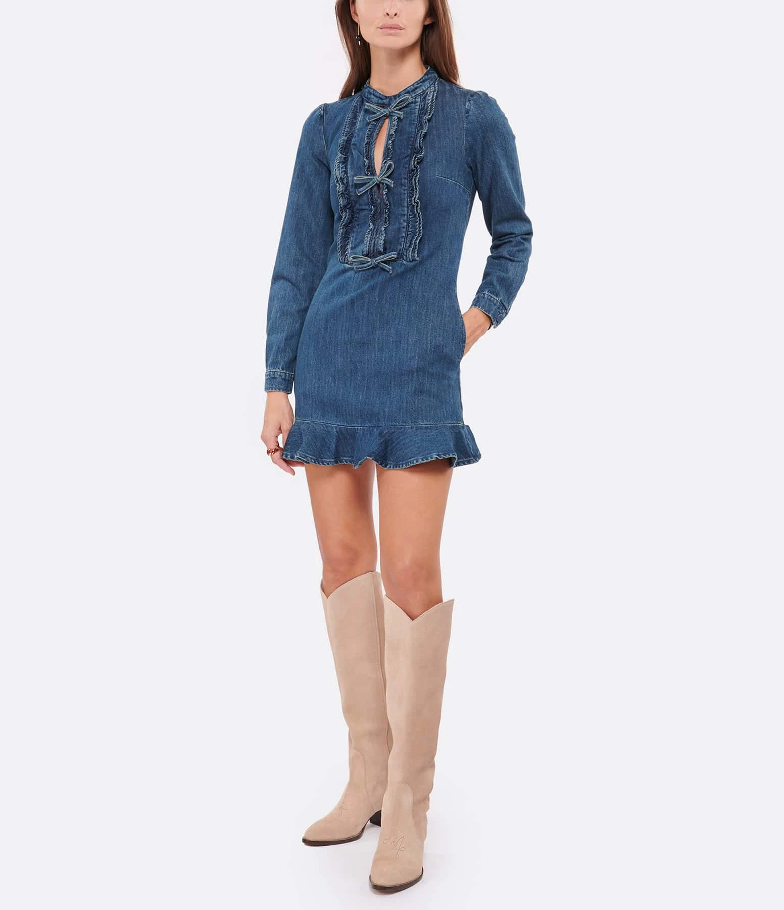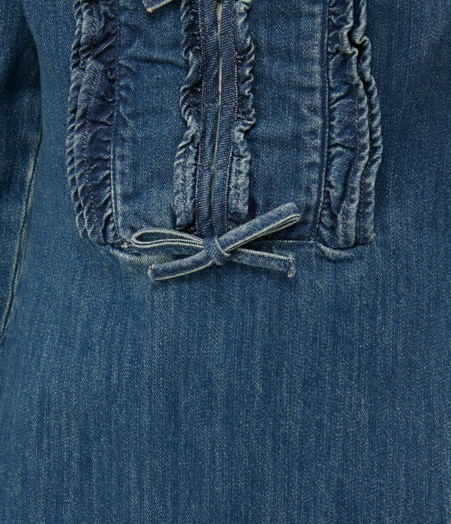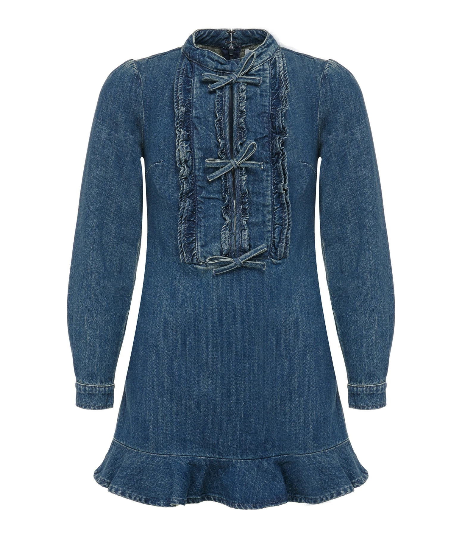 Robe courte en denim de coton bleu foncé délavé réhaussée d’un plastron à volants et orné de nœuds. Col rond. Manches longues bouffantes avec fentes et poignets boutonnés. Boutons recouverts du même tissu que la robe. Fermeture zippée invisible dans le dos. Coupe buste ajustée. Coupe jupe légèrement évasée. Base arrondie volantée.