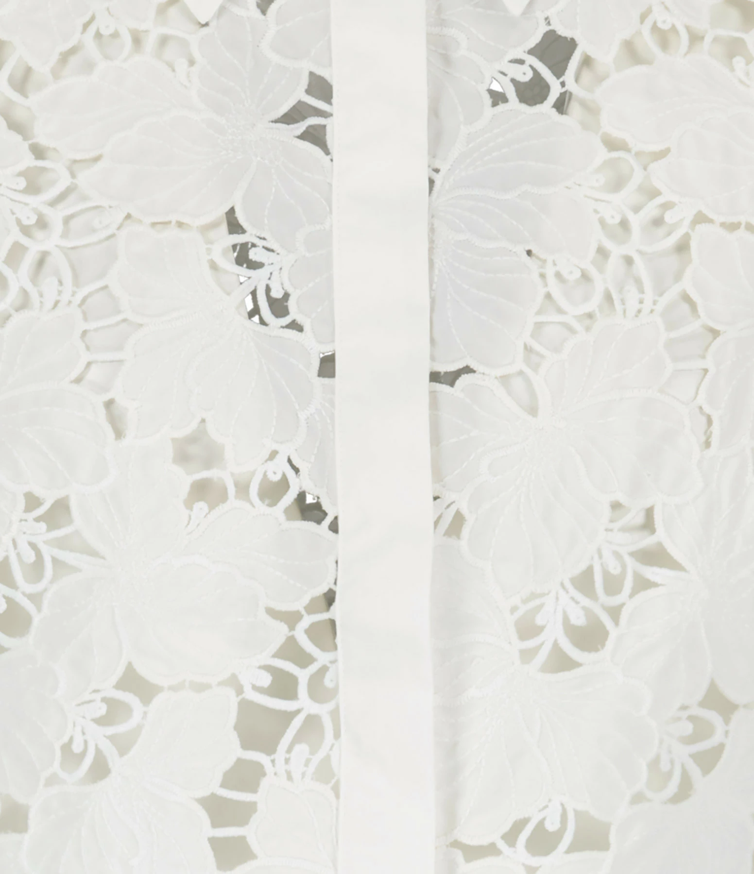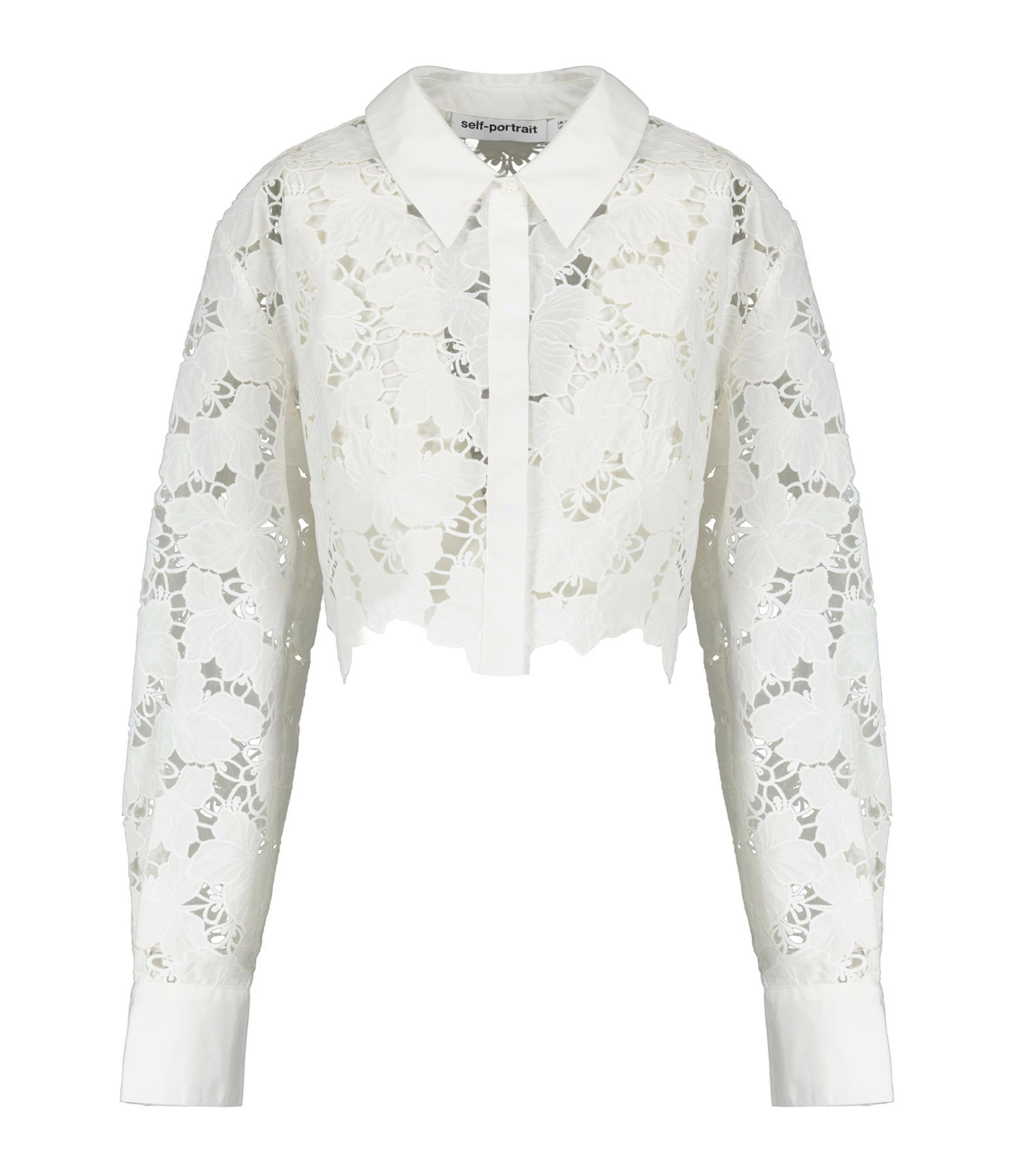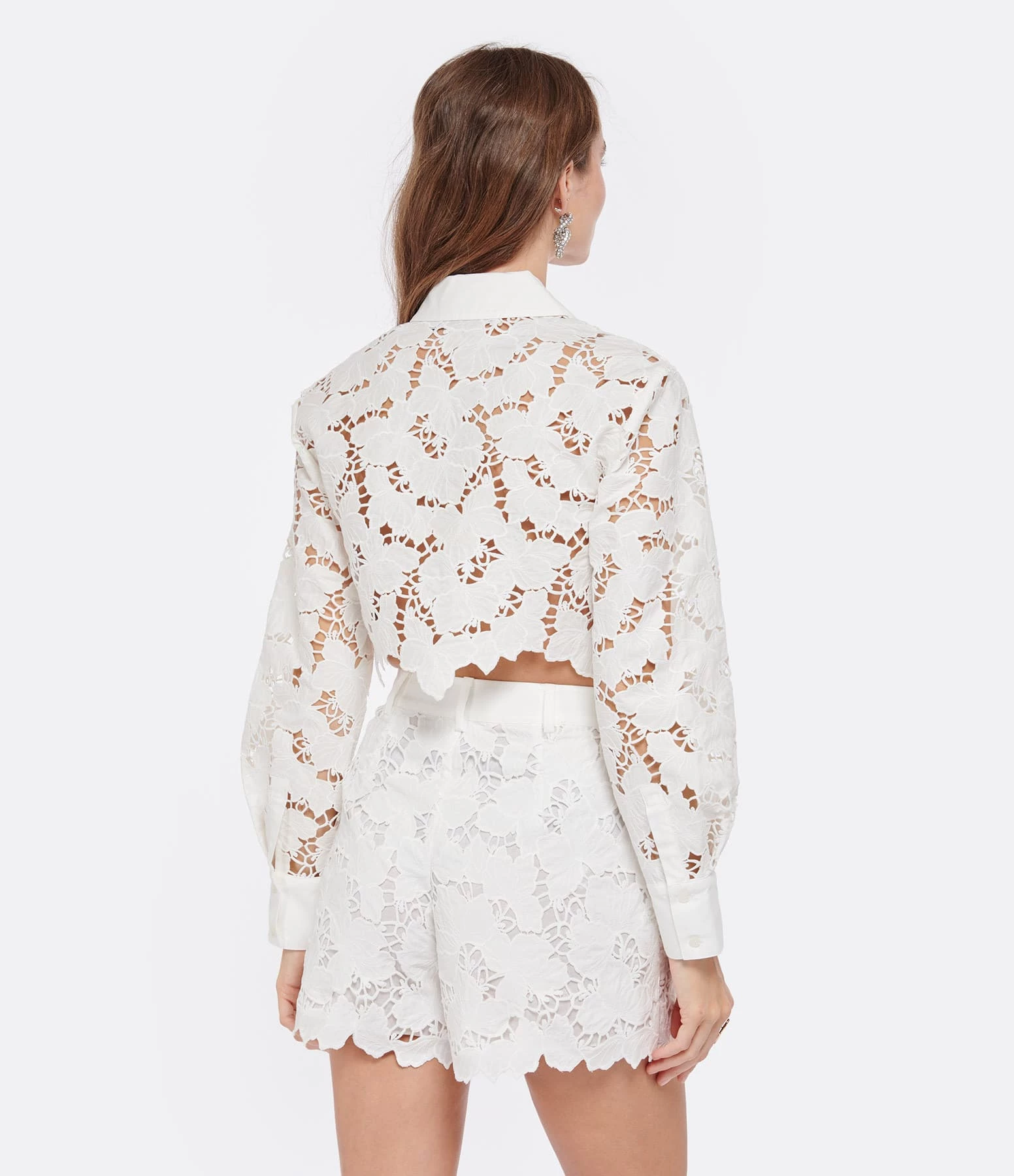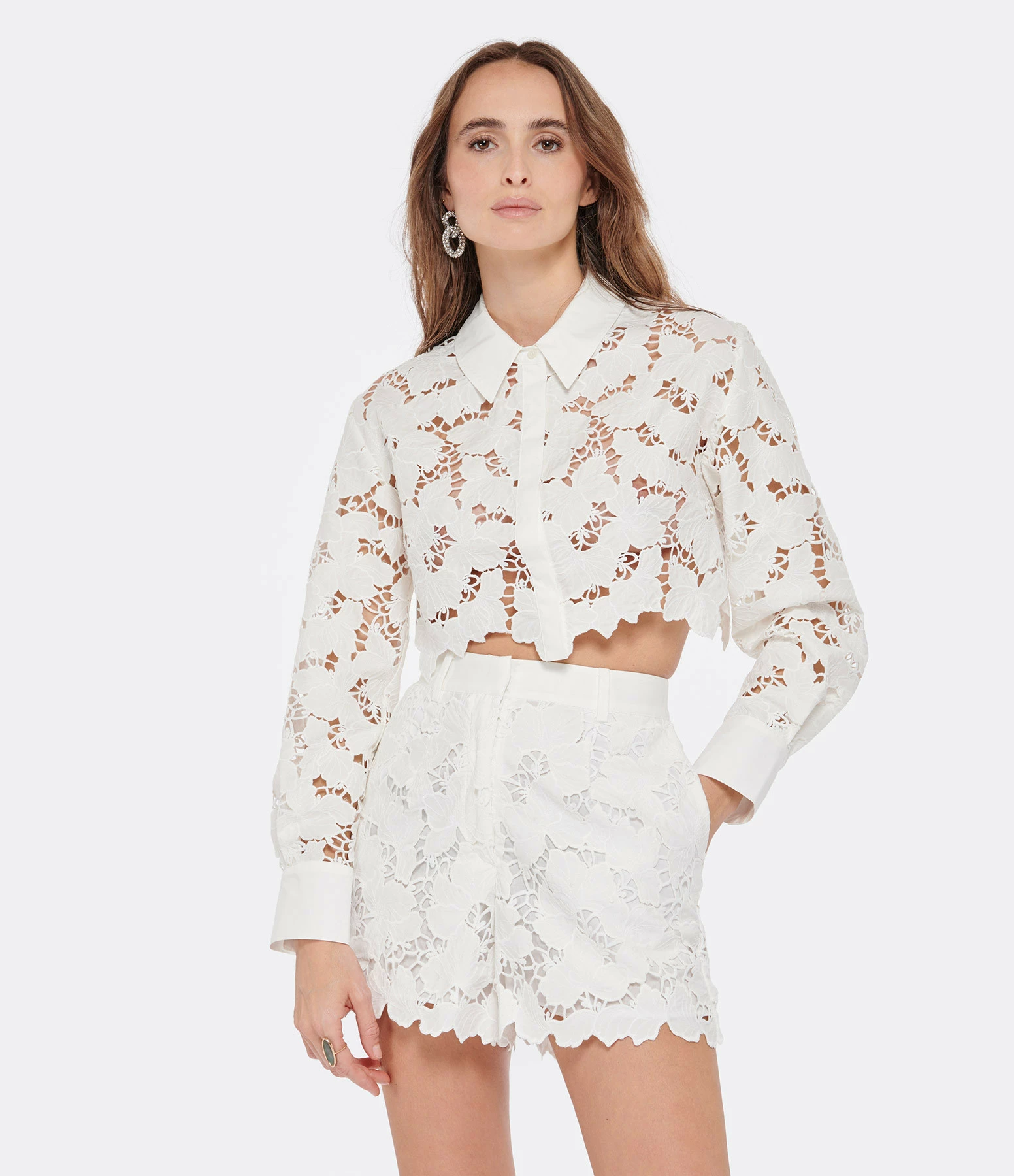 Chemise courte blanche en dentelle de coton. Col chemise avec un bouton. Manches longues avec poignets boutonnés.