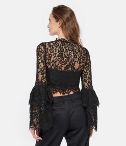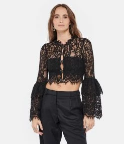 Top court noir en dentelle de coton. Manches longues larges avec volants au bout. Col rond. Fermeture boutonnée sur le devant. Gros boutons effet diamant noir et argenté. Doublé au niveau de la poitrine.