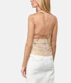 Top en résille beige et strass jaune. Col rond fermé par une agrafe dans le dos. Manches longues. Coupe droite. Base droite.