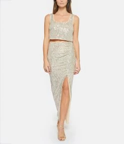 Crop top à bretelles à sequins argentés. Encolure carrée. Coupe droite. Base droite. Doublé.
