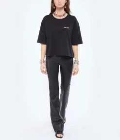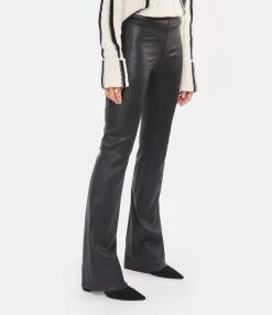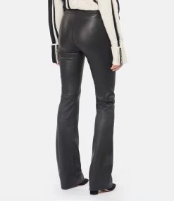 Pantalon en cuir noir. Taille élastiquée. Coupe flare.