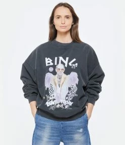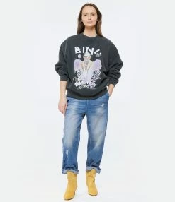 Pull en coton noir délavé sérigraphié. Col rond côtelé. Manches longues avec poignets côtelé. Coupe droite. Base droite.