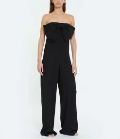 Combinaison noire bustier avec nœud au niveau du buste. Tissu à nouer sur l’arrière. Fermeture zippée noire sur l’arrière. Coupe droite. Base droite.