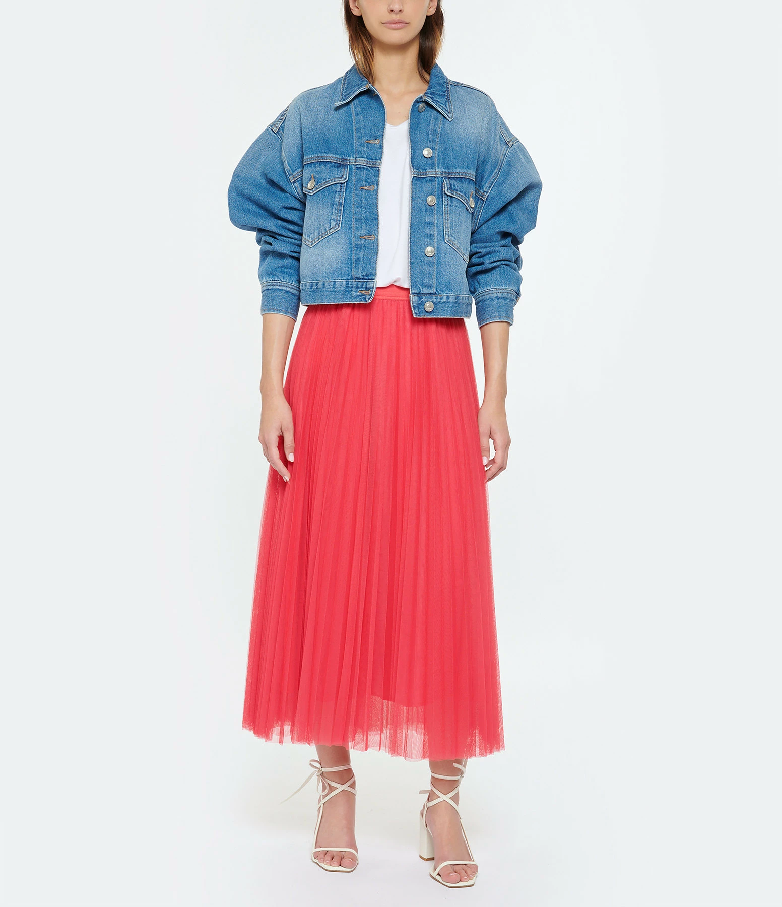 Jupe longue plissée en tulle rose. Élastique à la taille. Coupe évasée. Doublée.