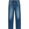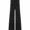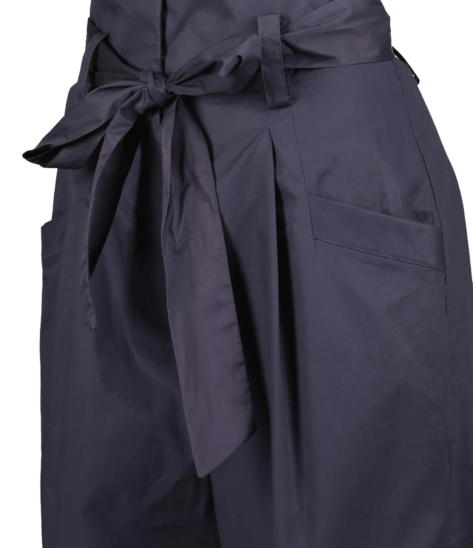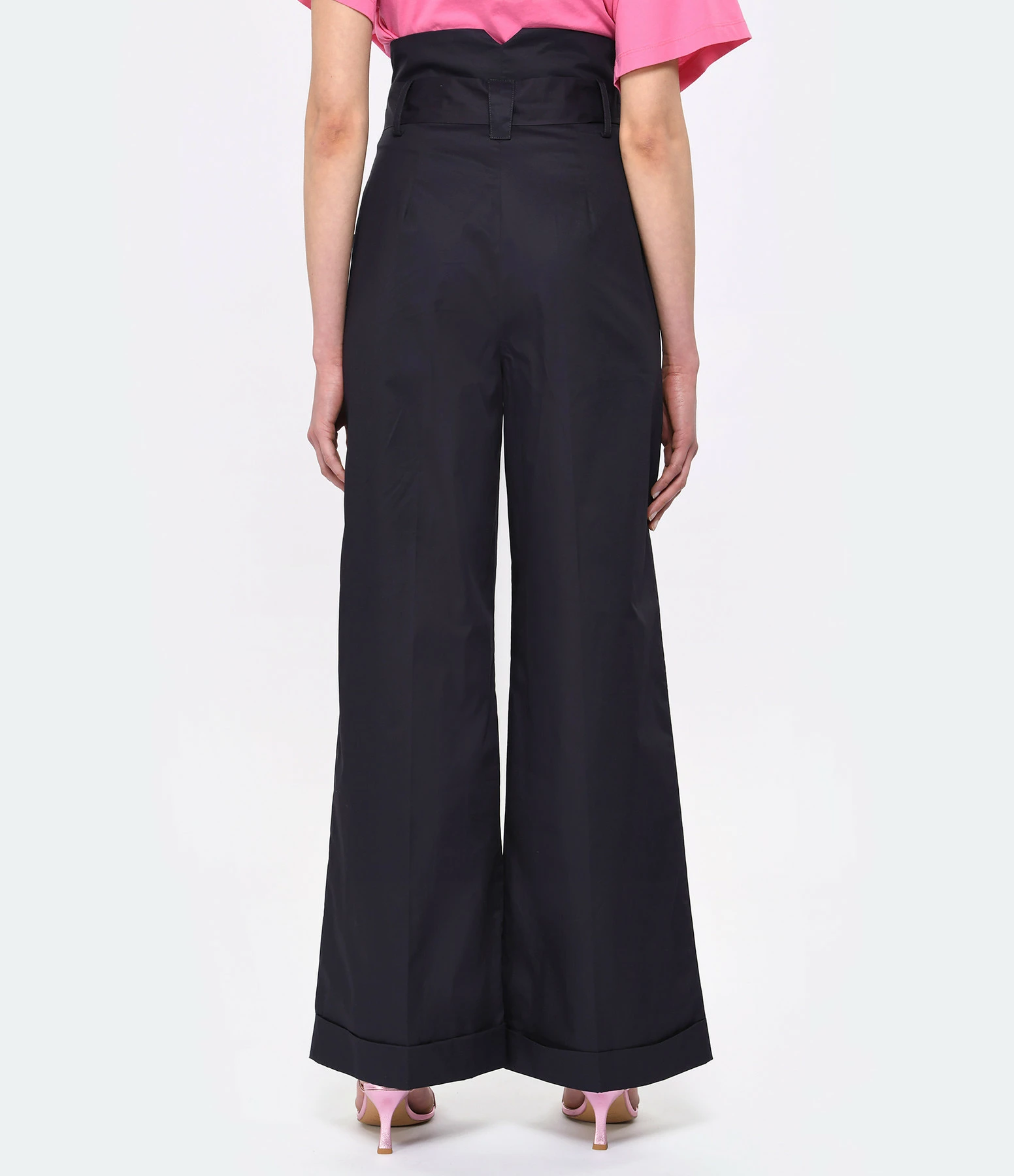Pantalon en coton bleu marine. Taille haute marquée d’une ceinture ton sur ton. Larges poches sur les côtés et des revers en bas de jambe. Coupe large.