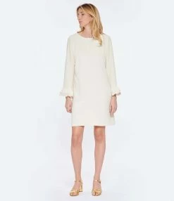 Robe courte écrue. Col rond. Manches longues, finitions volants avec broderies. Coupe droite. Base droite.