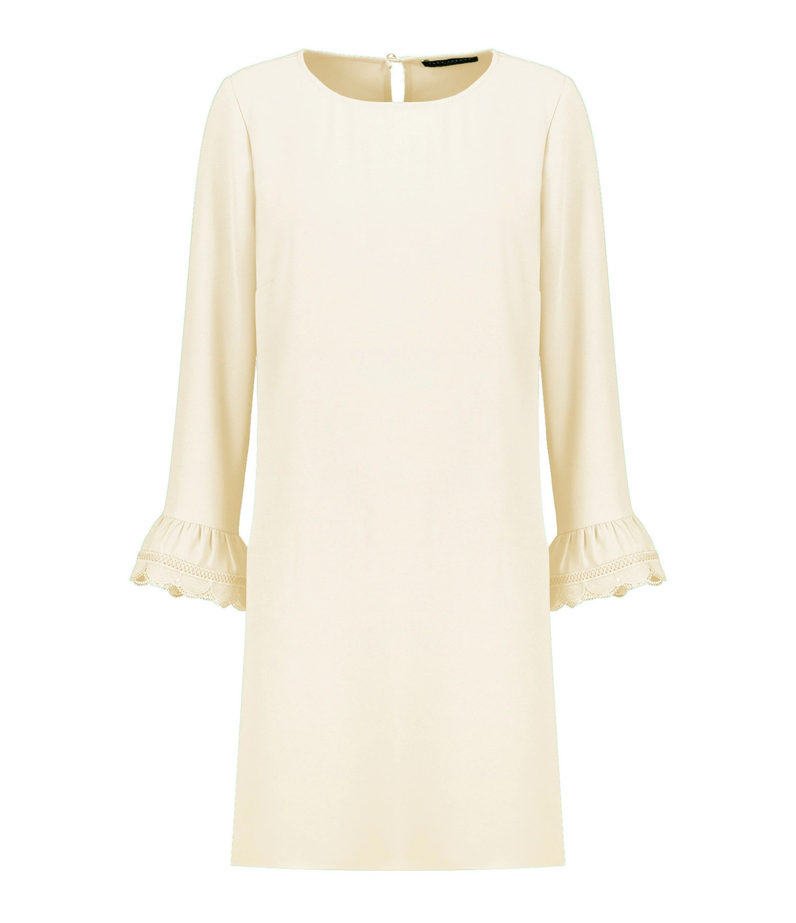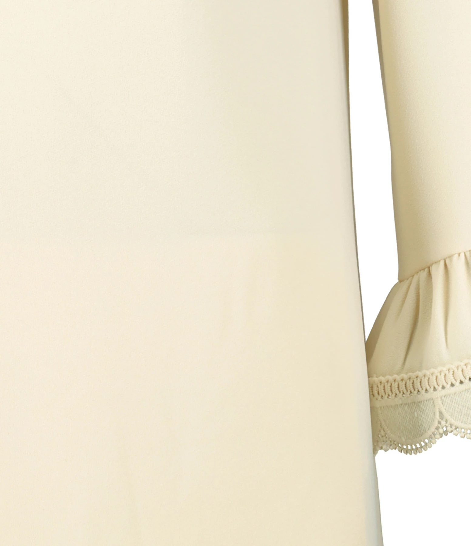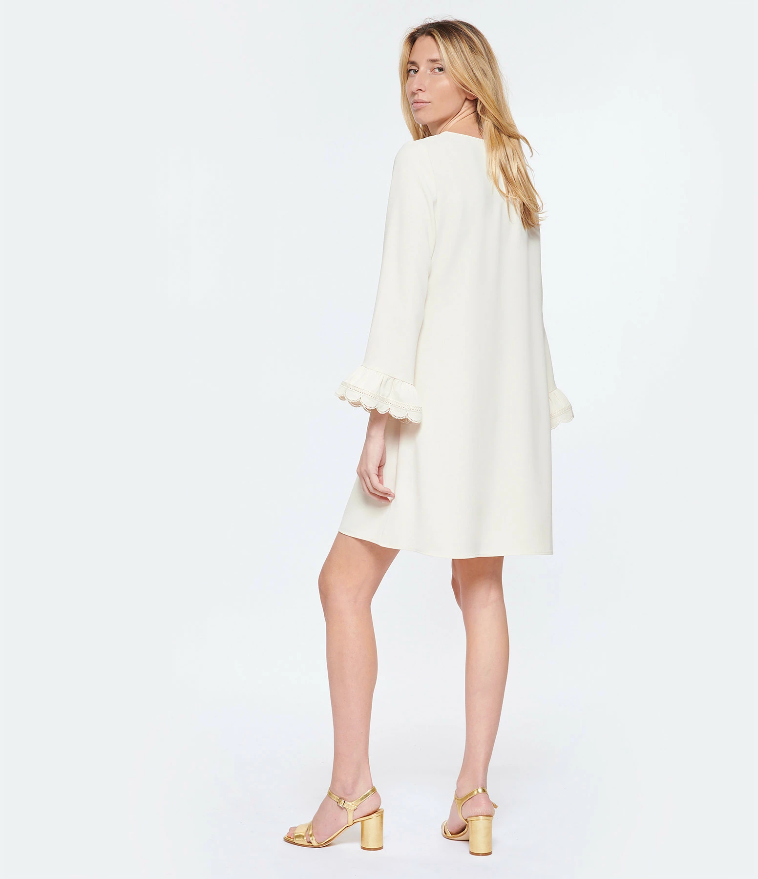 Robe courte écrue. Col rond. Manches longues, finitions volants avec broderies. Coupe droite. Base droite.
