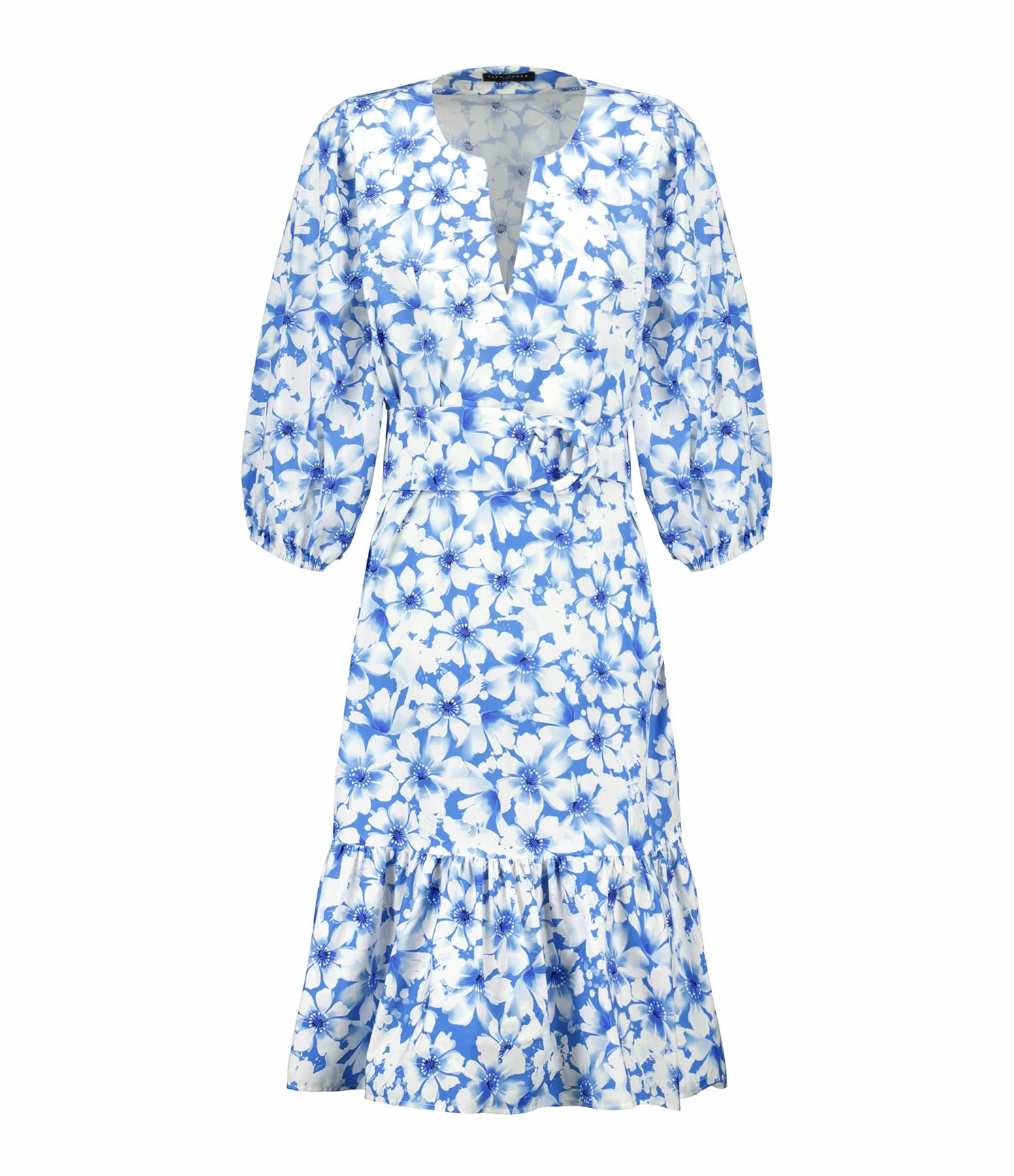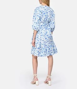 Robe courte en coton à imprimé fleuri bleu et blanc. Manches trois-quarts bouffantes. Col en V. Ceinture à imprimé assorti. Coupe évasée. Base volantée.