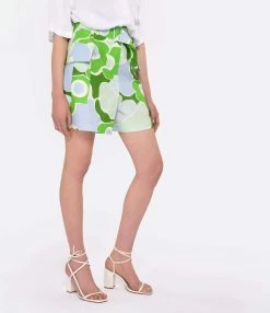 Short à imprimé vert. Fermeture zippée et par crochet invisible sur le devant. Ceinture imprimé assortie. Passants pour ceinture. Deux larges poches latérales à rabats. Coupe droite. Base droite.