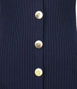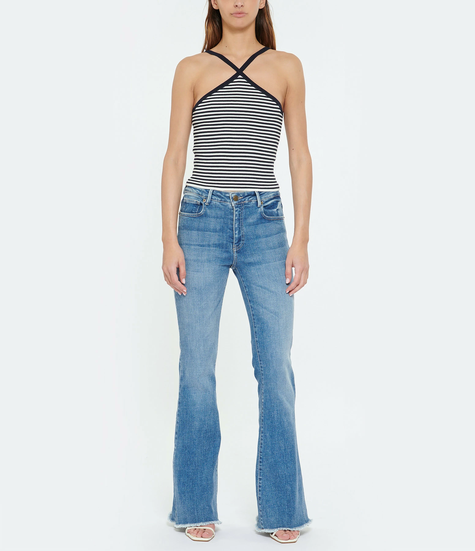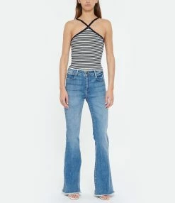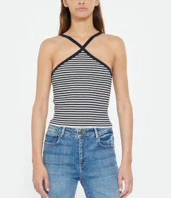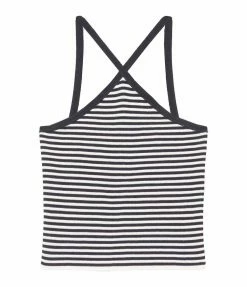 Top en maille noir et blanc à rayures. Encolure par bretelles croisées à l’avant. Coupe droite. Base droite.