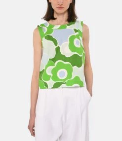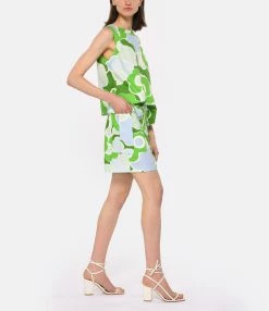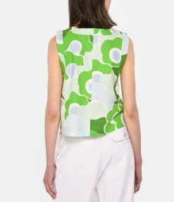 Top à imprimé vert sans manches. Col rond. Fermeture zippée invisible à l’arrière. Coupe droite. Base droite.