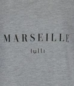 Tee-shirt en coton gris. Col rond. Manches courtes. Sérigraphie “MARSEILLE lulli” à l’avant. Coupe droite. Base droite.