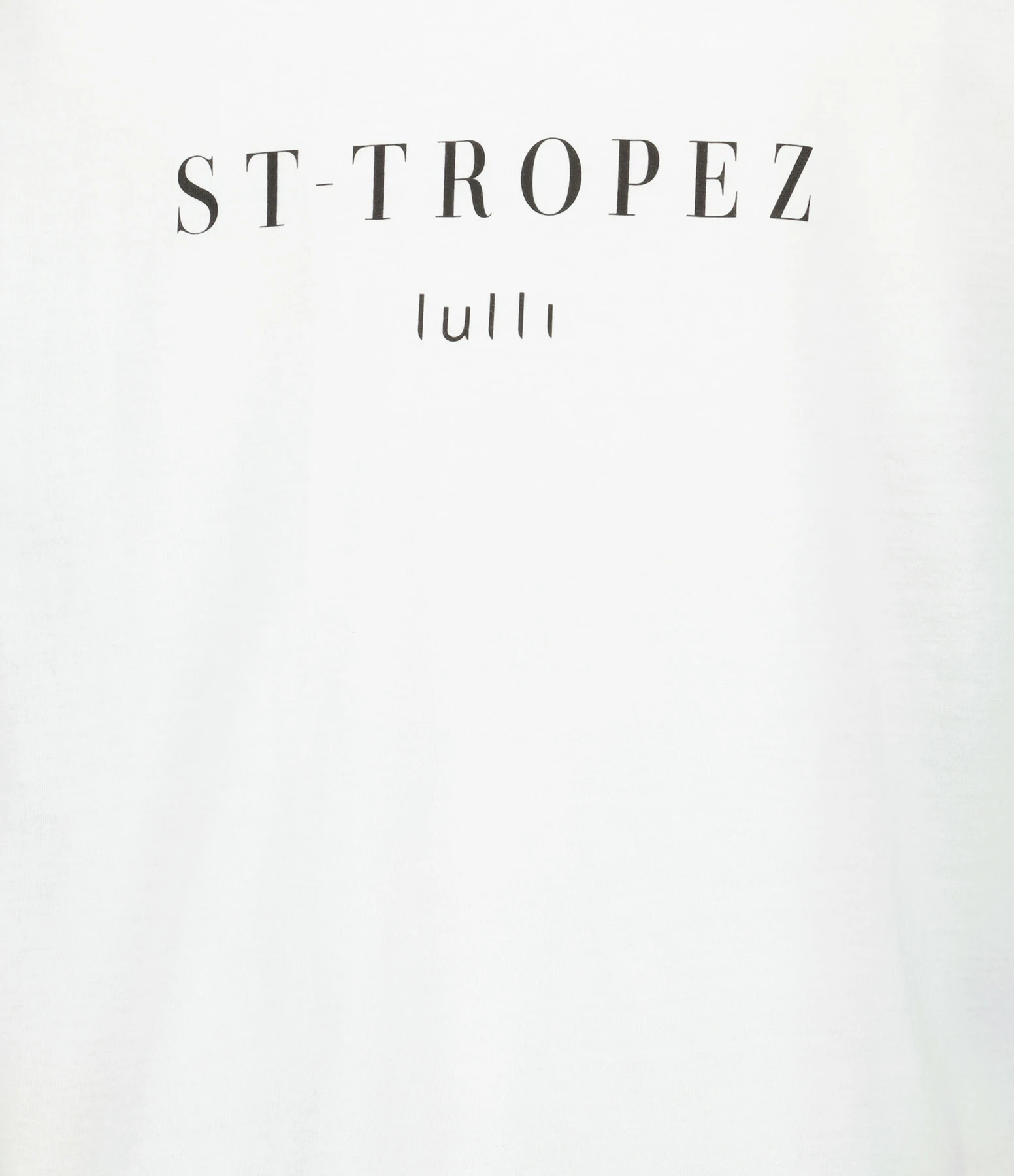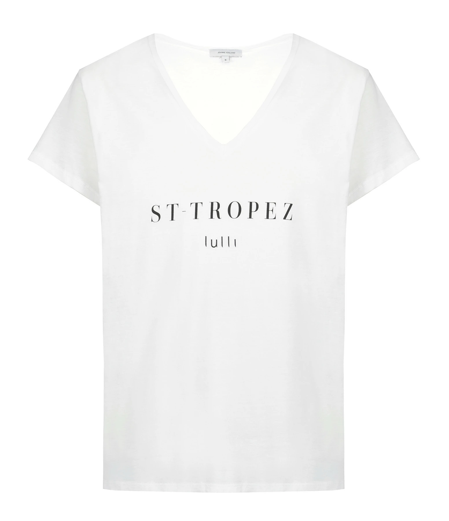 Tee-shirt en coton gris. Col V. Manches courtes. Sérigraphie “SAINT TROPEZ lulli” à l’avant. Coupe droite. Base droite.