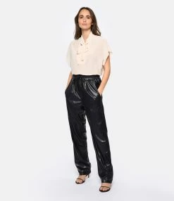 Blouse en soie mélangée beige. Col en V avec liens à nouer. Manches courtes Dolman. Fentes latérales. Coupe ample. Longueur plus courte sur le devant que dans le dos. Base arrondie.