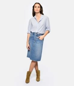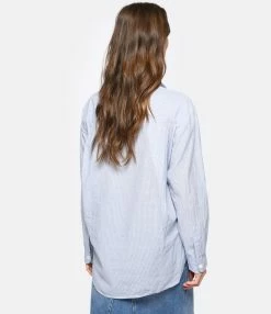 Chemise en coton à rayures bleu et blanche. Col rond. Manches longues avec fentes et poignets boutonnés. Fermeture boutonnée sur le devant. Boutons blancs nacrés. Coupe droite. Longueur plus courte sur le devant que dans le dos. Base arrondie.