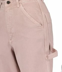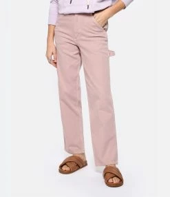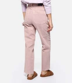 Pantalon en denim de coton stretch rose. Passants pour ceinture. Braguette zippée et boutonnée. Deux poches italiennes. Trois poches plaquées dans le dos. Coupe droite. Base droite.