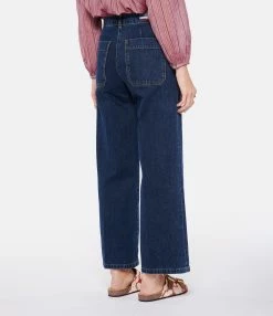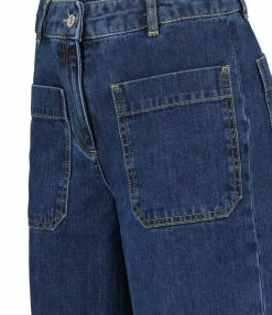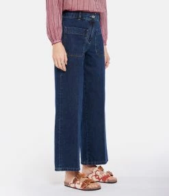 Jean droit en coton bleu. Taille haute avec passants pour ceinture. Braguette zippée et bouton métallique argentée avec logo. Deux poches plaquées sur le devant et deux poches plaquées dans le dos.