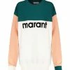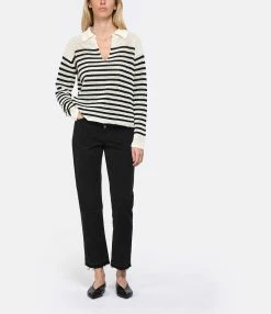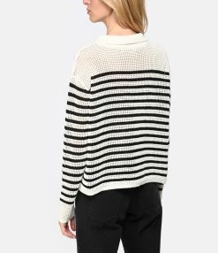 Pull à rayures écru et noir effet maille résille. Manches longues. Col tunisien. Coupe ample. Base droite.