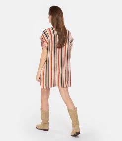 Pull en coton multicolore. Col V. Manches courtes avec bords effrangés. Coupe droite. Base droite avec fentes latérales. Non doublé.