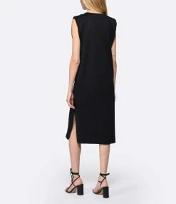 Robe mi-longue noire sans manches. Fentes latérales en bas. Fermeture par trois boutons métalliques dorés à l’épaule. Col rond. Coupe droite. Base droite.